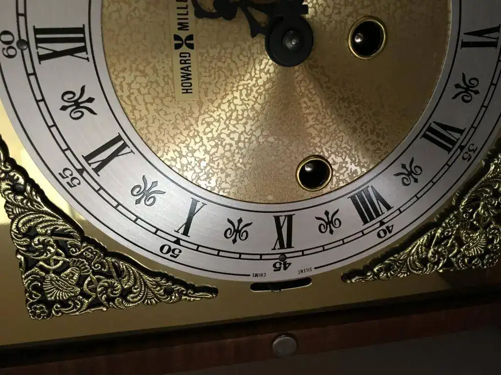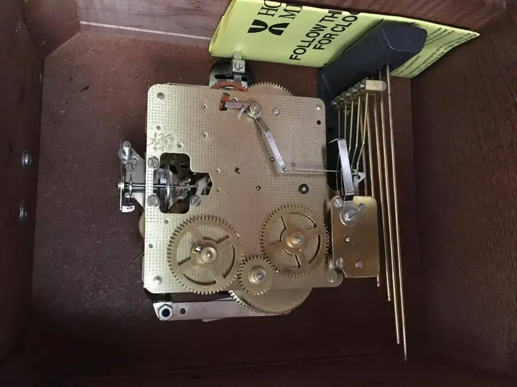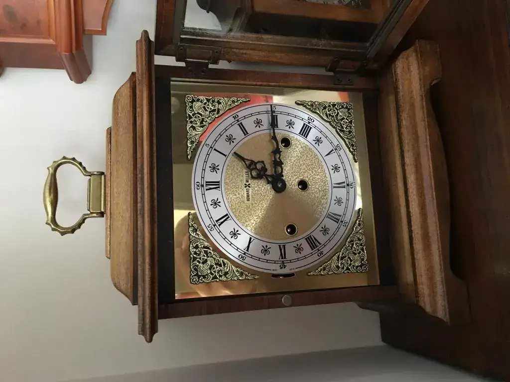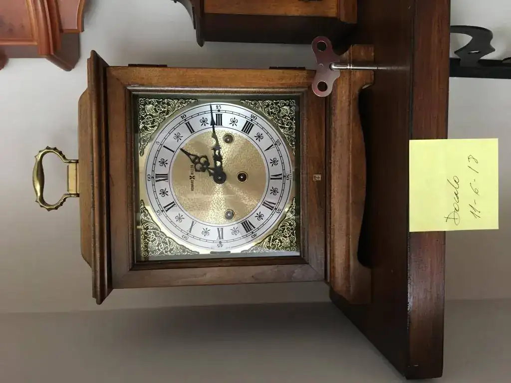 Reloj de sobremesa marca Howard Miller fabricado en 1994 en Estados Unidos. Maquinaria Hermle carrillon Westminster tocando todos los cuartos y las horas con la melodía Westminster, palanca de desconexion de la soneria en la esfera. maquinaria mecanica de cuerda de 8 dias con escape de espiral plano de ultima generacion, limpia y aceitada. estado nos, como salido de fabrica. Mide 36x26cm. Estado y funcionamiento impecable. instrucciones incluidas. 295€ envio incluido por mensajeria.