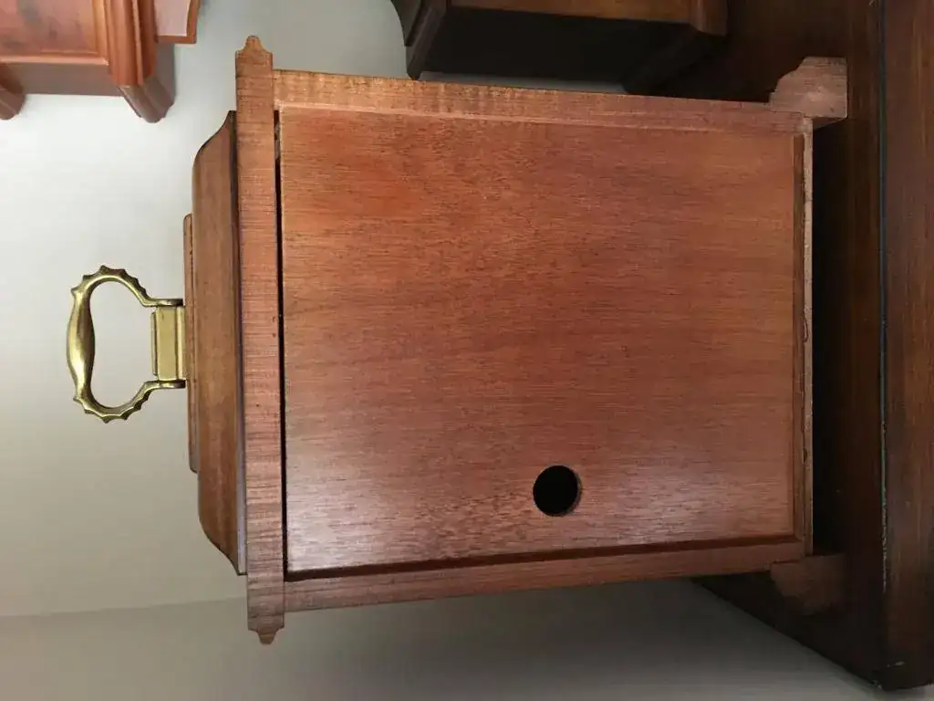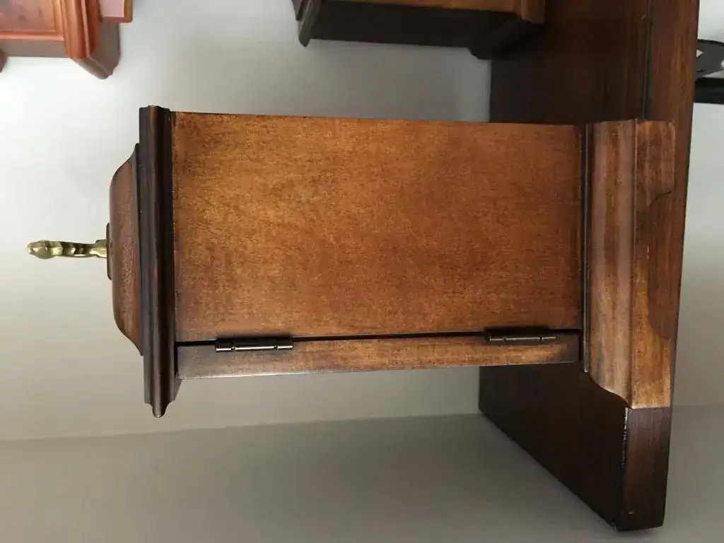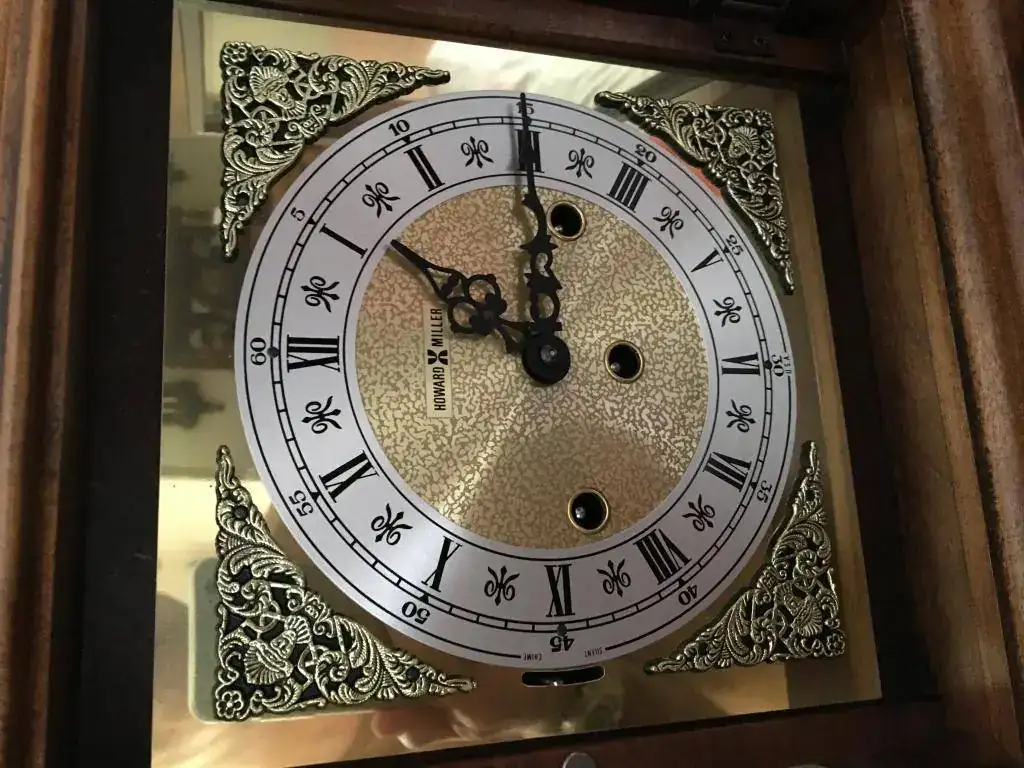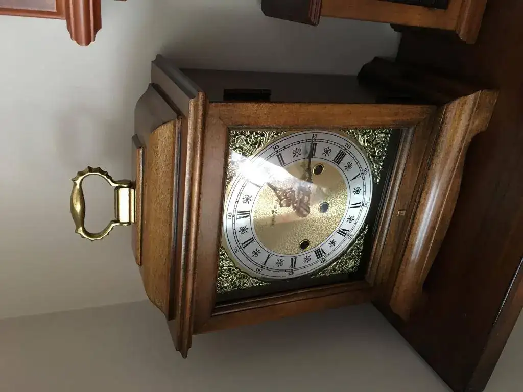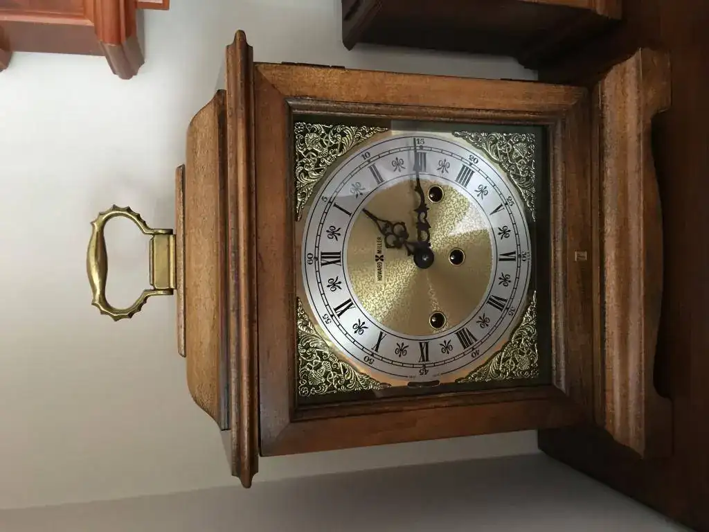 Reloj de sobremesa marca Howard Miller fabricado en 1994 en Estados Unidos. Maquinaria Hermle carrillon Westminster tocando todos los cuartos y las horas con la melodía Westminster, palanca de desconexion de la soneria en la esfera. maquinaria mecanica de cuerda de 8 dias con escape de espiral plano de ultima generacion, limpia y aceitada. estado nos, como salido de fabrica. Mide 36x26cm. Estado y funcionamiento impecable. instrucciones incluidas. 295€ envio incluido por mensajeria.