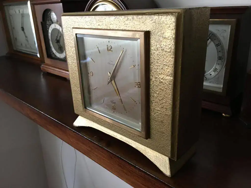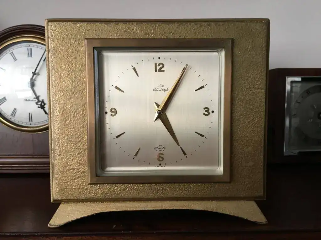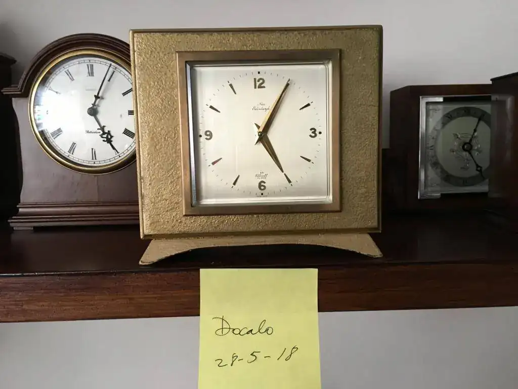 Fabricado en Reino Unido en los años 60 por Elliott of London, maquinaria mecanica de cuerda de 8 dias sin soneria, escape de plataforma de 7 rubies, caja en madera de nogal dorada, buen estado y funcionamiento. Mide 16X15cm. revisado, limpiado y aceitado. 110€ con envio incluido por mensajeria.