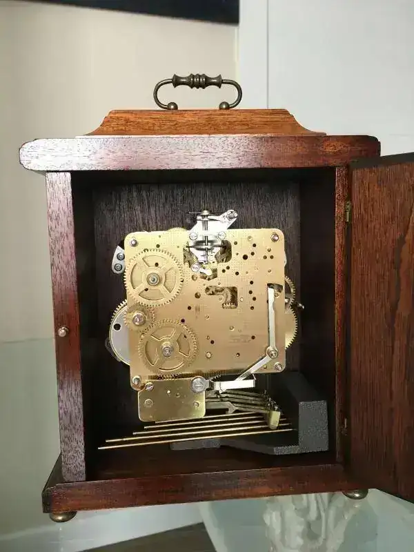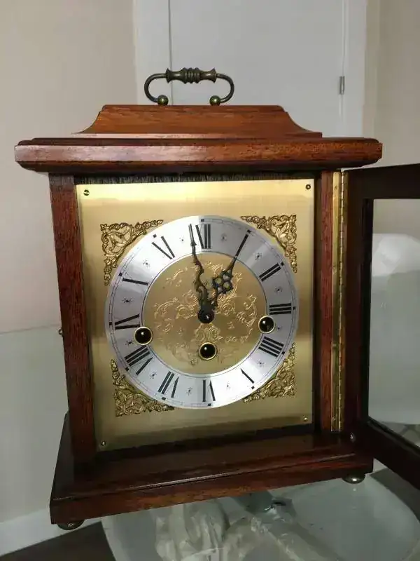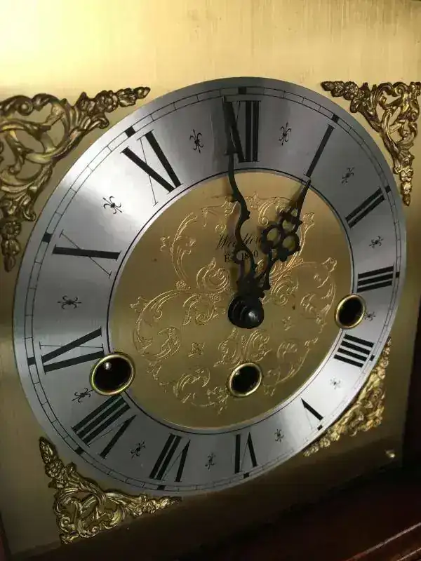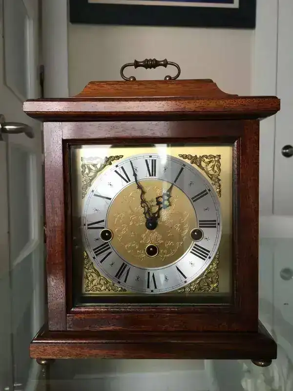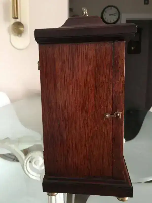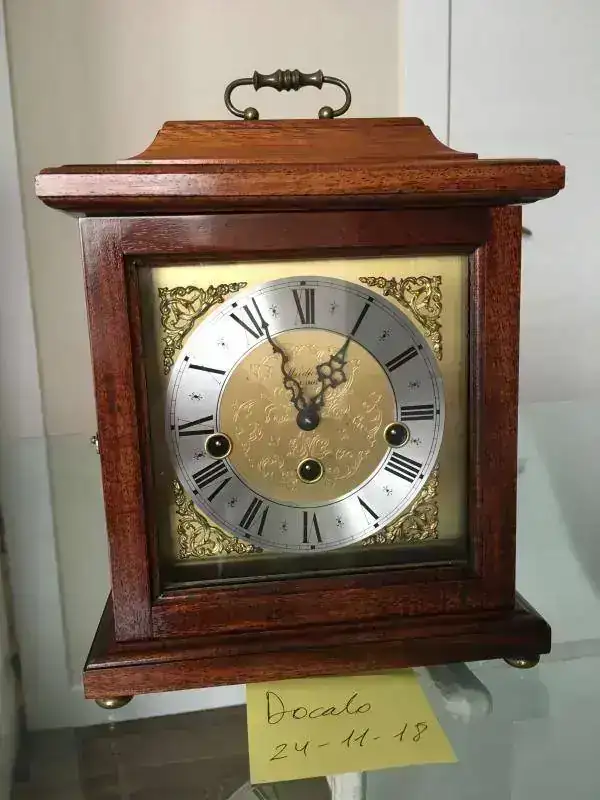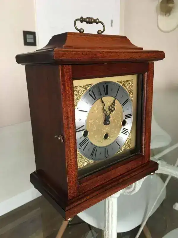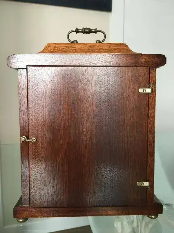 Reloj de sobremesa fabricado en Reino Unido en 2000, nuevo de stock de almacen. Maquinaria Hermle carrillon tocando todos los cuartos y las horas con la melodía Westminster, palanca para desconexion de soneria. maquinaria mecanica de cuerda de 8 dias con escape flotante de espiral plano de ultima generacion, mueble en madera de caoba maciza . Mide 25x20cm sin contar el asa. Estado y funcionamiento excelente. 245€ envio incluido por mensajeria.