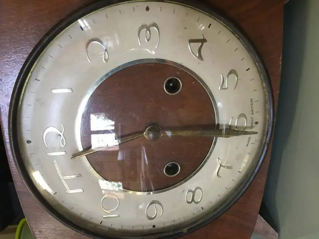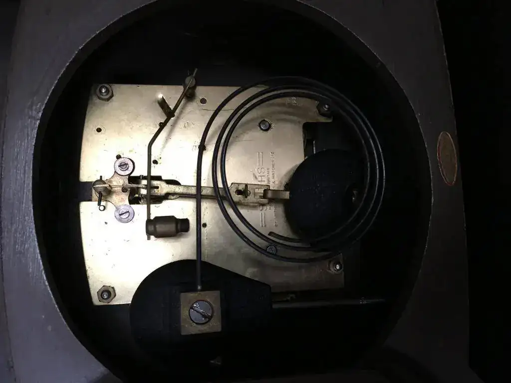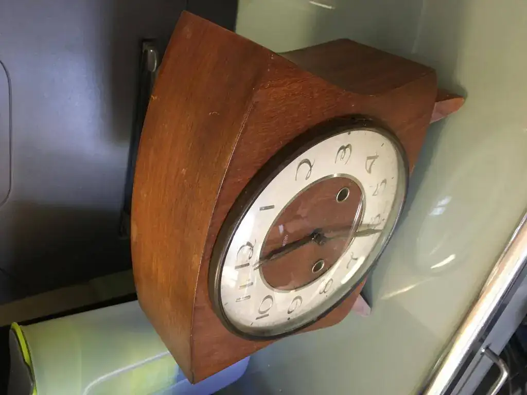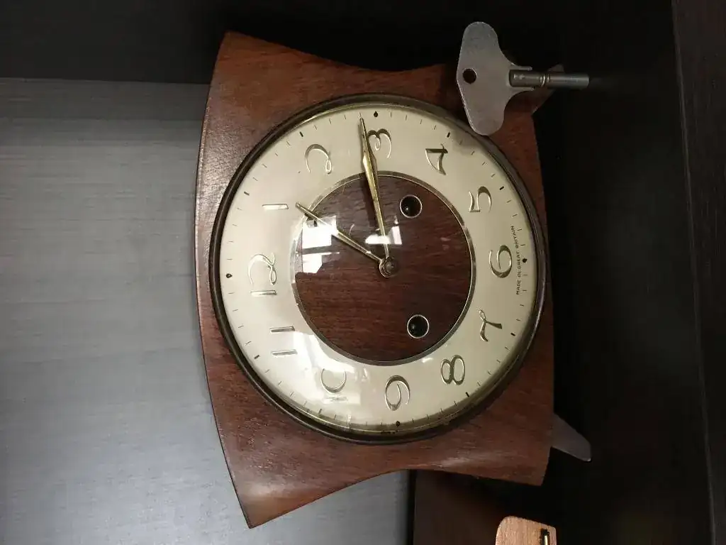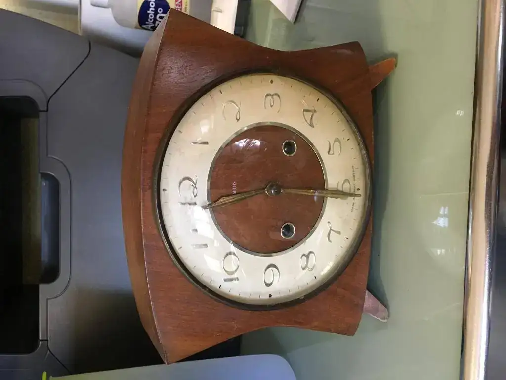 Reloj de sobremesa ingles marca Smiths fabricado en los años 50 en Reino Unido. Maquinaria mecanica de 8 dias son soneria en horas y medias sobre espiral, palanca para desconexion de la soneria. Mide 22x19cm. Estado y funcionamiento excelente. Reloj revisado, maquinaria limpia y aceitada.