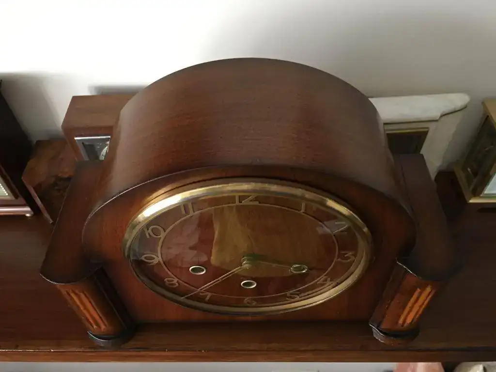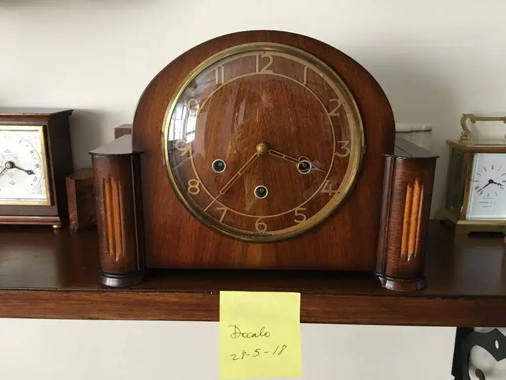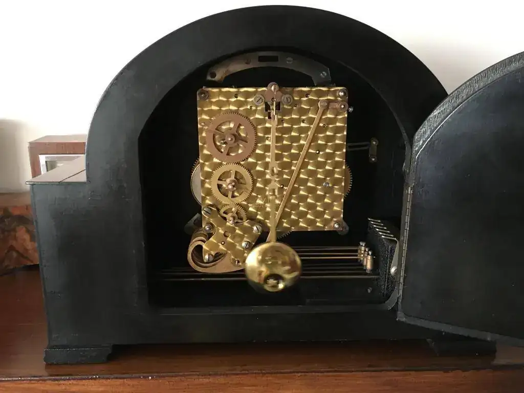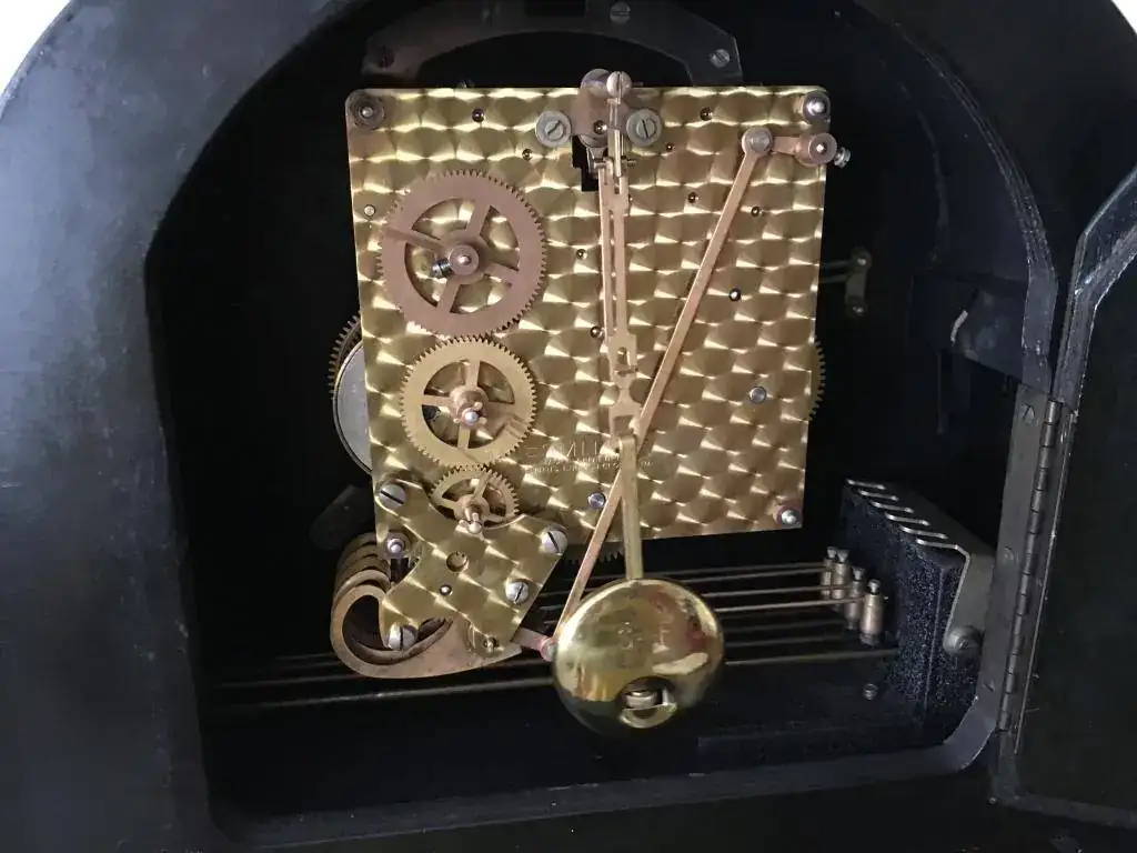 Reloj de sobremesa marca Smiths fabricado en los años 50 en Reino Unido. Maquinaria carrillon Westminster tocando todos los cuartos y las horas con la melodía Westminster, palanca de desconexion de la soneria en la esfera. maquinaria decorada con escape por pendulo, limpia y aceitada. Mide 32x24cm. Estado y funcionamiento muy bueno. 130€ envio incluido por mensajeria.