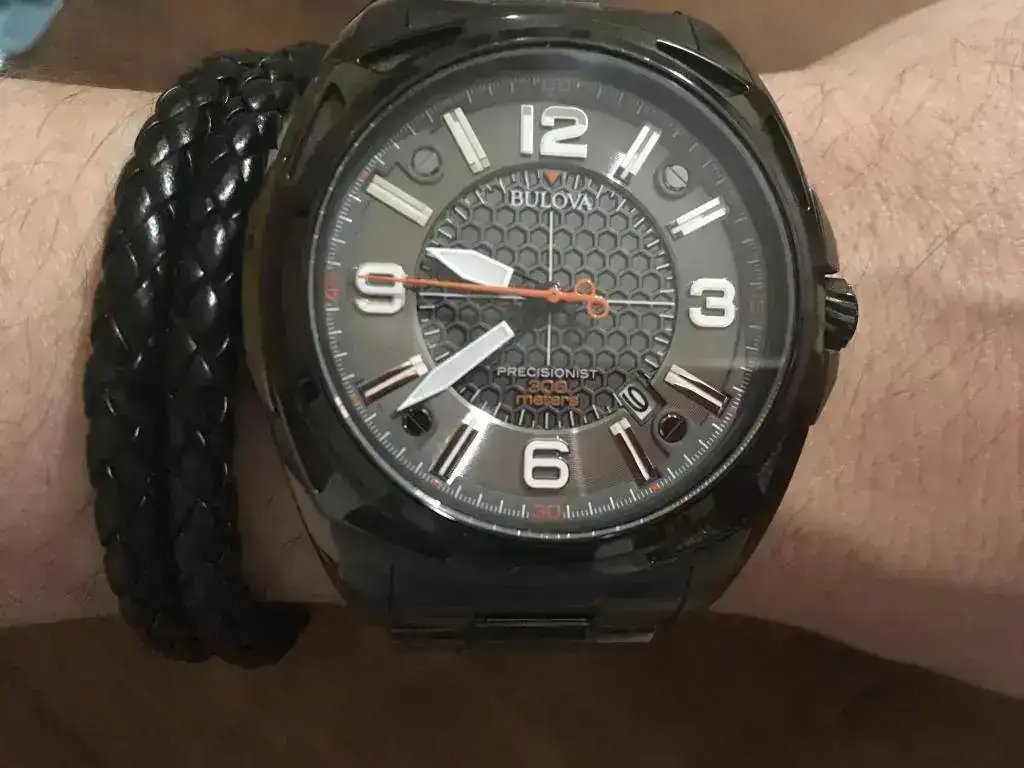 Hoy salió este polivalente Bulova Precisionist. La verdad es un placer mirar como corre el segundero de manera contínua como con los automáticos. Acabado en gris oscuro, combinacion con naranja, 300 mts, una mezcla de diver con reloj de vestir y deportivo, un engendro particular... amor a primera vista. Ya lleva casi dos años conmigo.