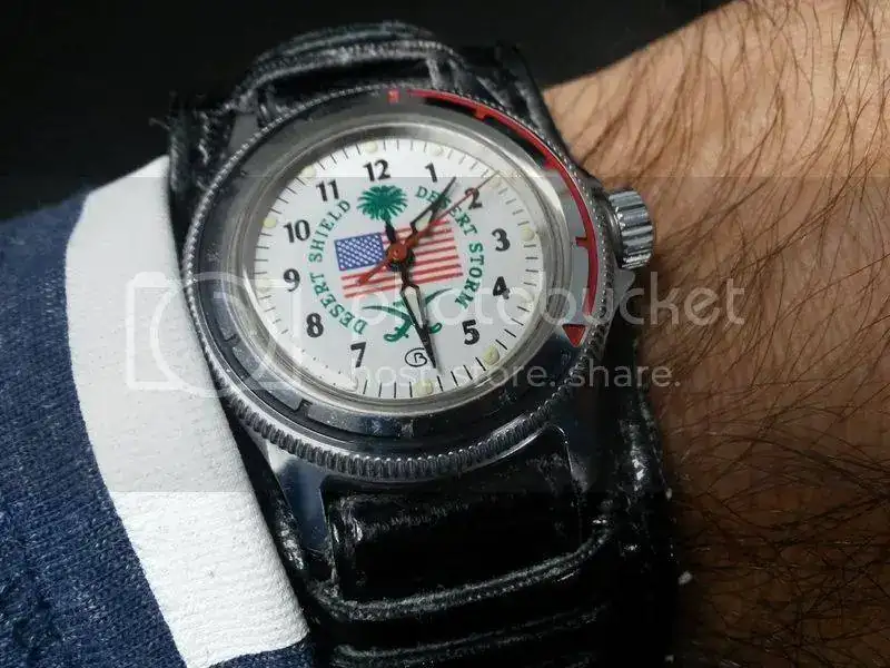 Ayer y hoy estoy llevando el reloj más chiquitín que tengo: un Vostok Komandirskie, edición especial Desert Shield/Desert Storm. De tamaño cadete. Lo llevo con una bund, para compensar su pequeña medida.