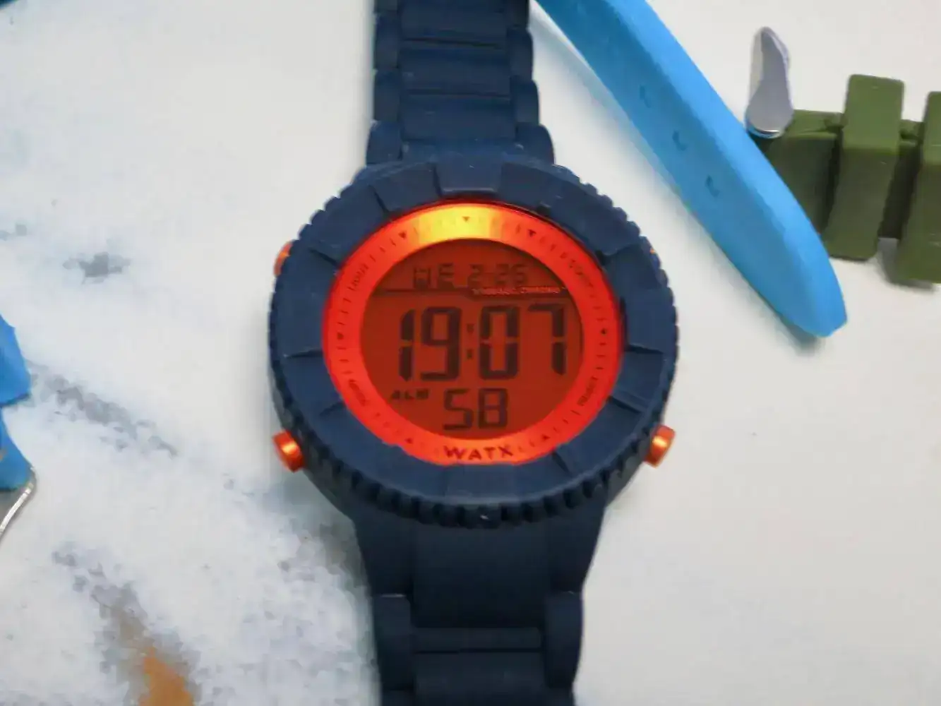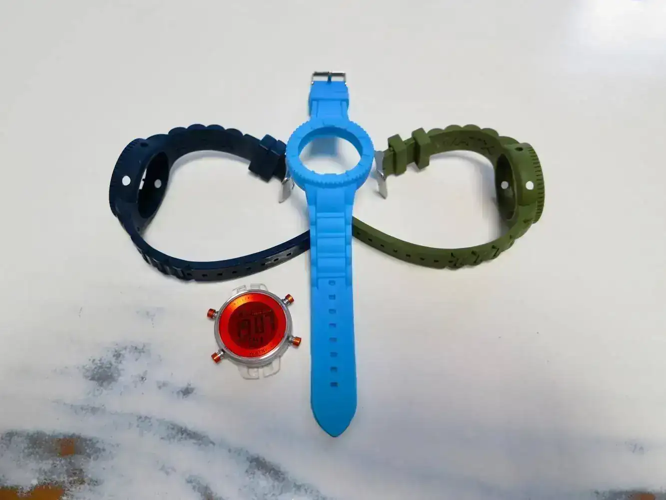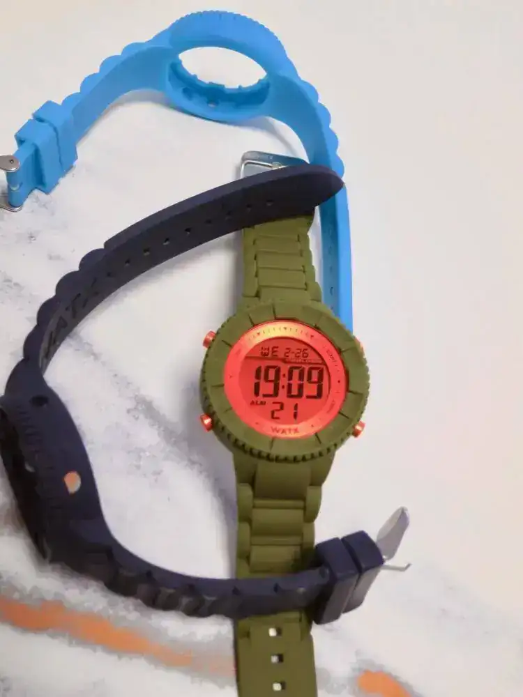 Por limpieza de mi caja de relojes y quitar piezas que ya no uso pongo en venta este reloj digital Watx poco usado. El reloj lo entrego sin caja y con 3 correas intercambiables de silicona en colores azul marino, azul claro y verde militar. No tengo la caja. Las correas se cambian muy fácilmente en apenas 10 segundos.