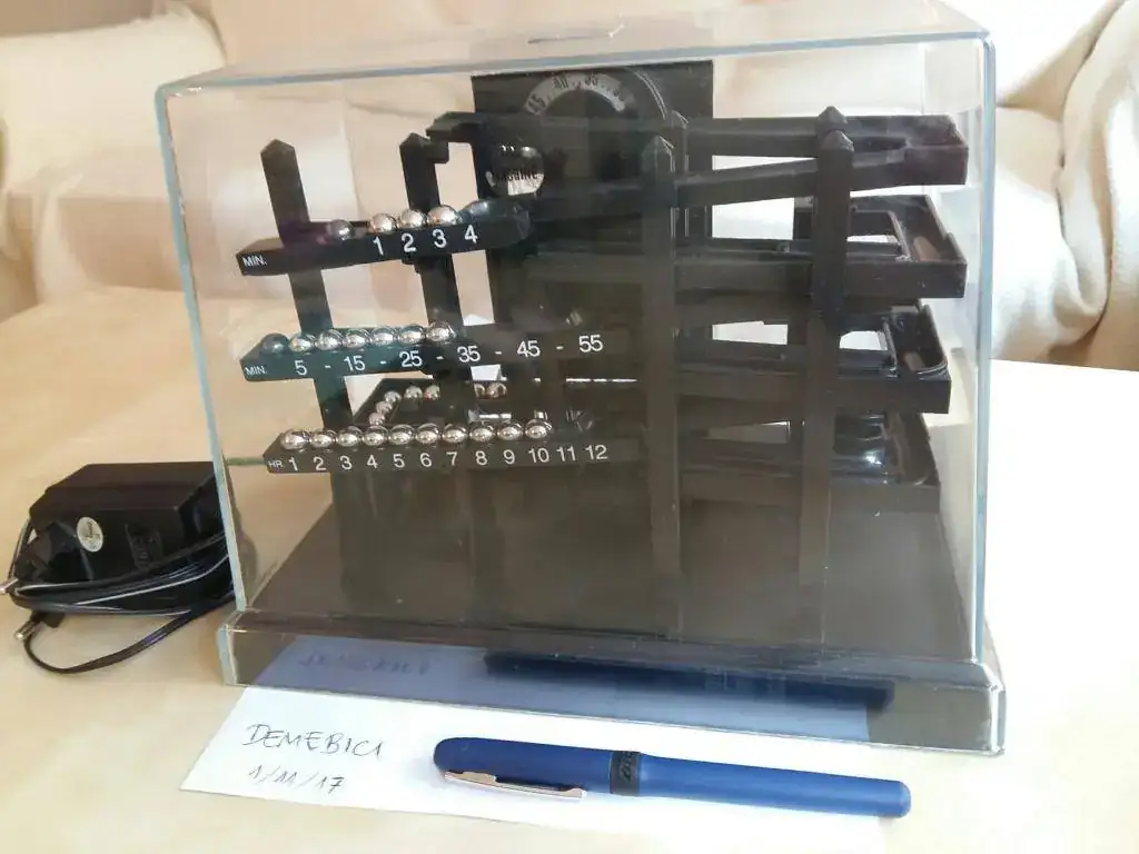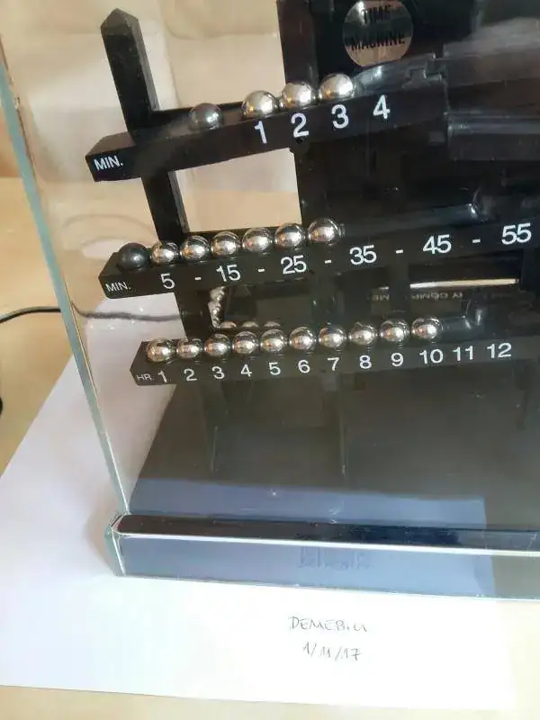 El reloj indica la hora con bolas de acero. Hay tres bandejas numeradas. La de abajo es para las horas, y las dos de arriba para los minutos. Un brazo giratorio sube una bola cada minuto desde un depósito a la vista, y la deposita en el rail superior, que la lleva hasta la bandeja de arriba calibrada para los minutos. Cada cinco bolas, la bandeja superior se desequilibra por el peso y vuelca, depositando una de sus bolas en el central, haciendo correr el resto mediante raíles hacia el depósito. Cada bola representa así 5 minutos en esta bandeja. Cada hora la bandeja intermedia pasa de los 55 minutos a los 60 minutos por una nueva bola, vuelca por gravedad, y deposita una bola en la bandeja de las horas, que marca por tanto una hora completa más. Cada 12 horas también la bandeja inferior se desequilibra. Éste es el momento más especial, pues se produce el vuelco secuencial de todas las bandejas, que mandan sus bolas al depósito con un bonito tintineo, quedando listas para recibir nuevas bolas con el paso del tiempo. Todo muy ingenioso y bonito Ved el vídeo que he subido a youtube, hecho por mí de mi reloj.