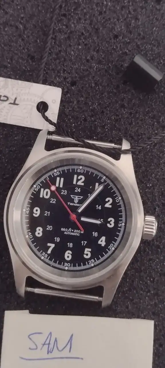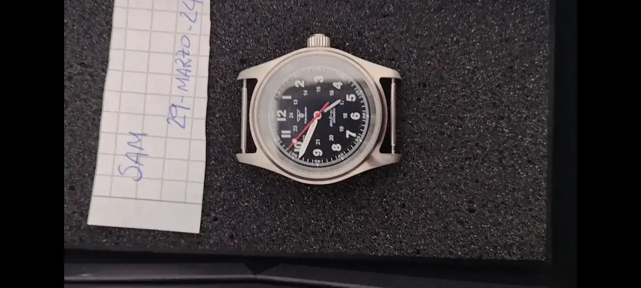 El reloj no tiene ninguna puesta, solo lo he puesto en hora, así que quien se lo quede lo estrena. Monta el más que probado NH35 con parada de segundero y remonte manual. Funciona perfecto. Tiene un tamaño ideal, muy cómodo y fiel a las medidas de los relojes militares en los que se inspira. Tiene cristal de zafiro y corona roscada.