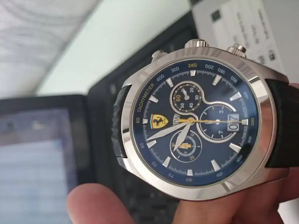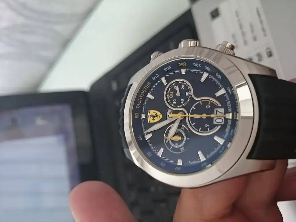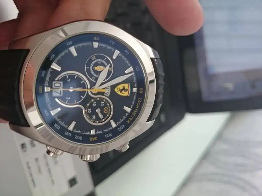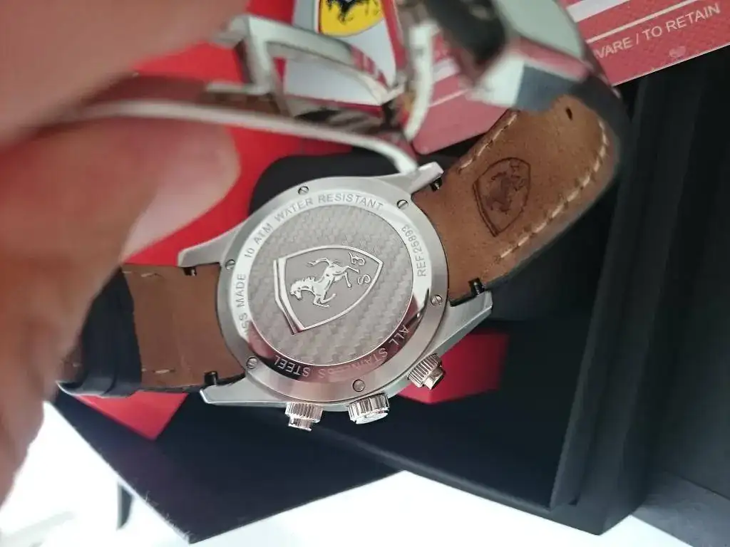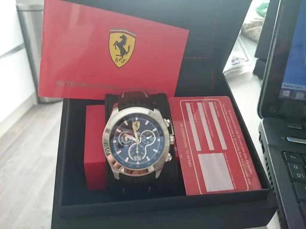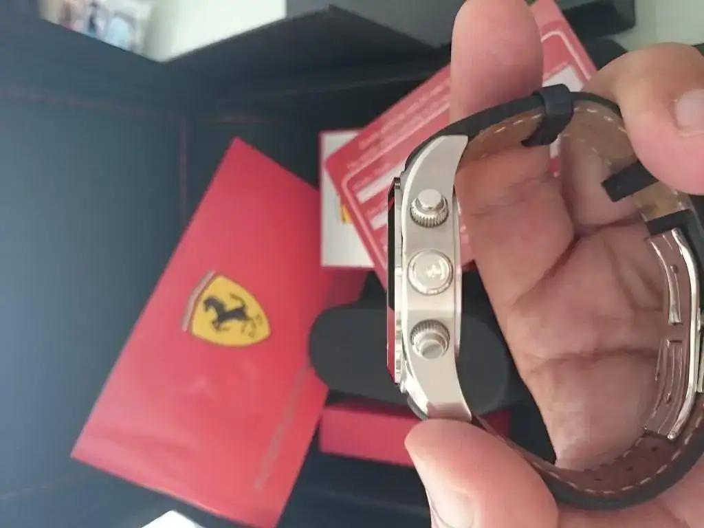 Saco a la venta este fantástico reloj Ferrari, con unos acabos espectaculares, cristal zafiro antirreflejos con tonos azulados, calendario independiente las unidades de las decenas, las tres coronas roscadas.