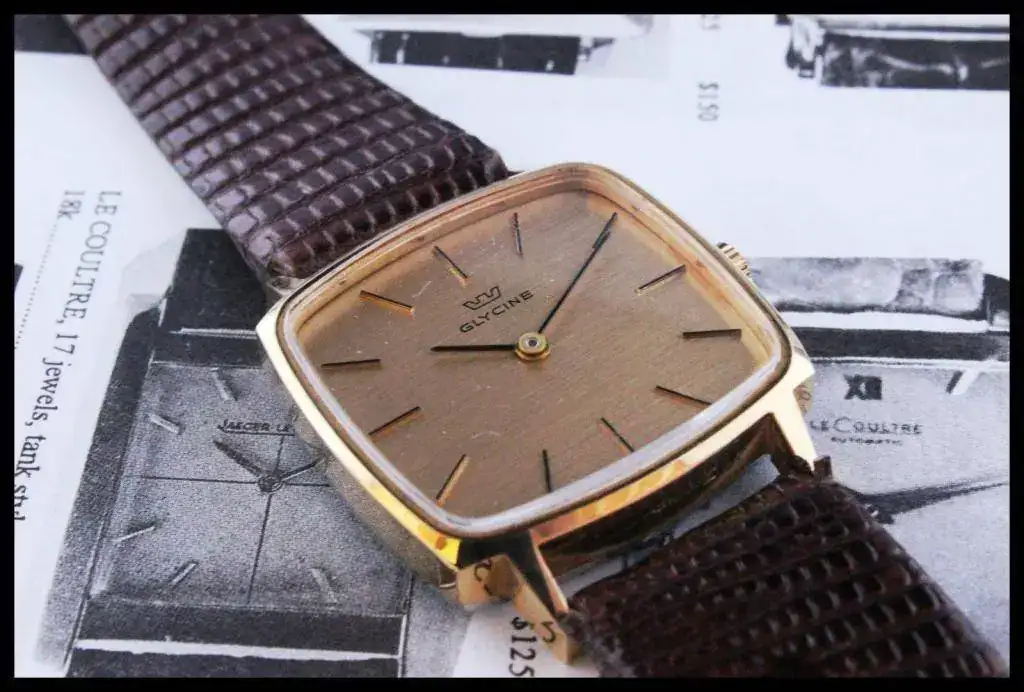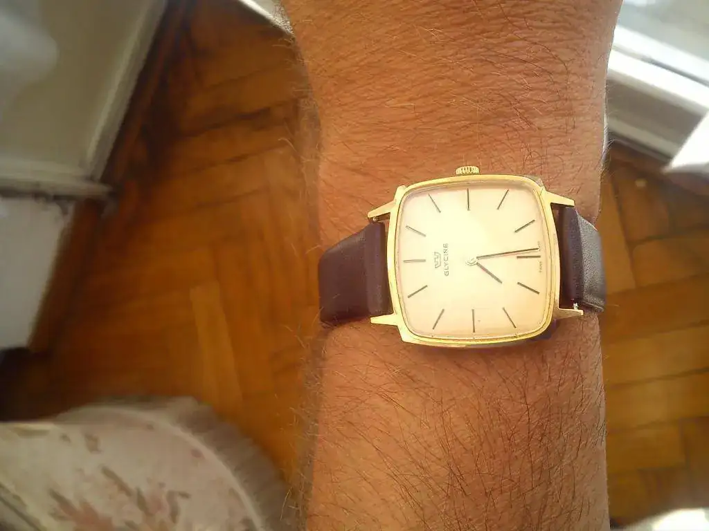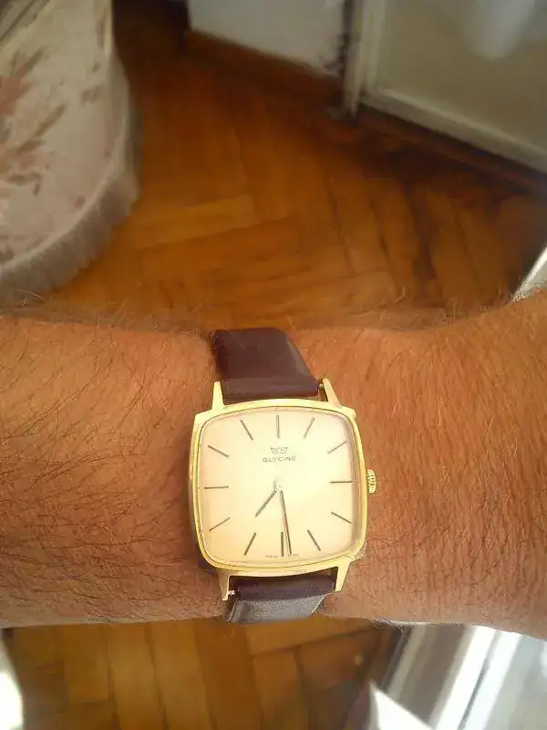 Reloj Glycine años 70. Funciona correctamente y en muy buen estado. Correa de piel marrón con hebilla original. Corona original. Mide 30mm, pero al ser cuadrado parece mayor. Mecánico.