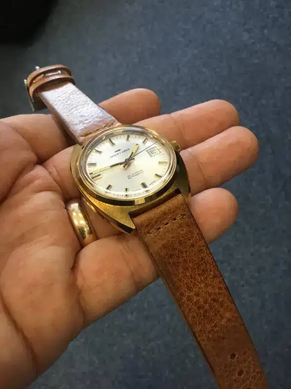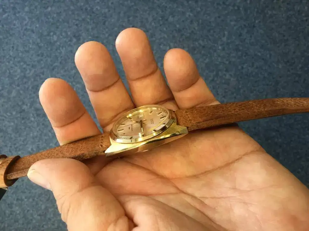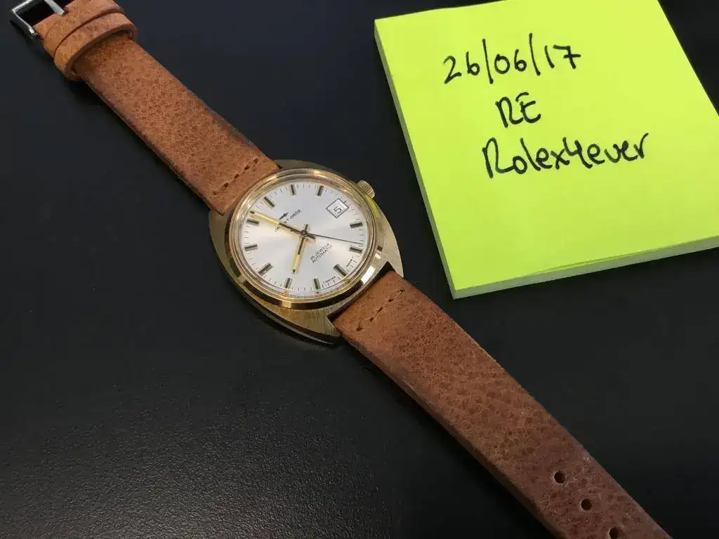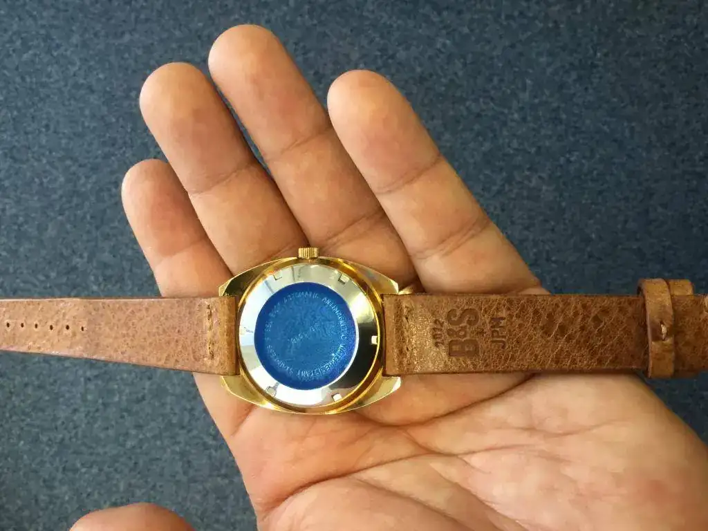 El reloj es NOS (New Old Stock). Nunca ha sido usado, no me lo he puesto ni una vez. Le he puesto una bella correa envejecida de Bulang and Sons (B&S) nueva que le favorece mucho. Sólo la correa cuesta 100 euros.