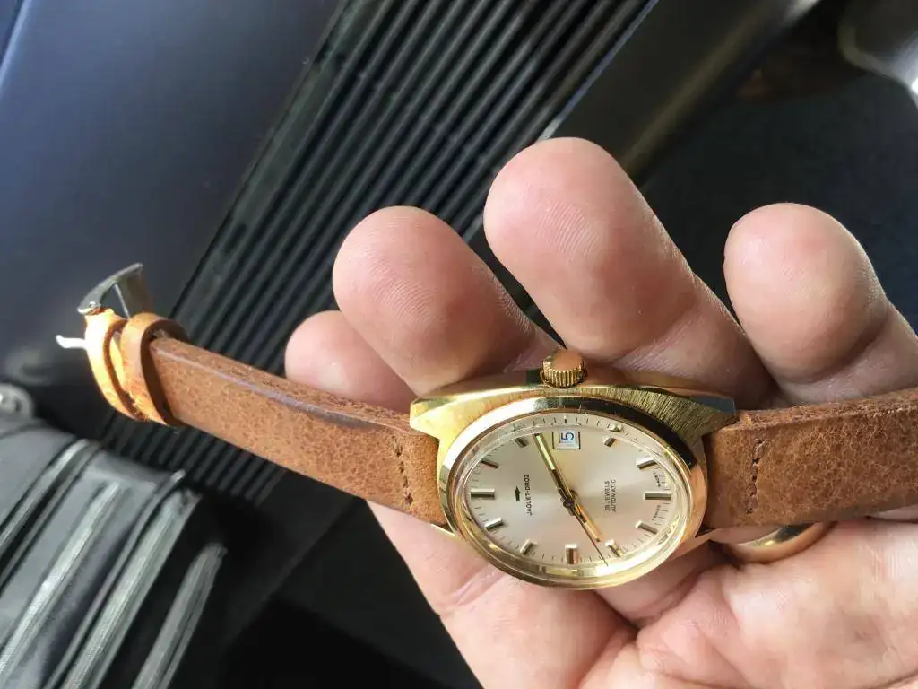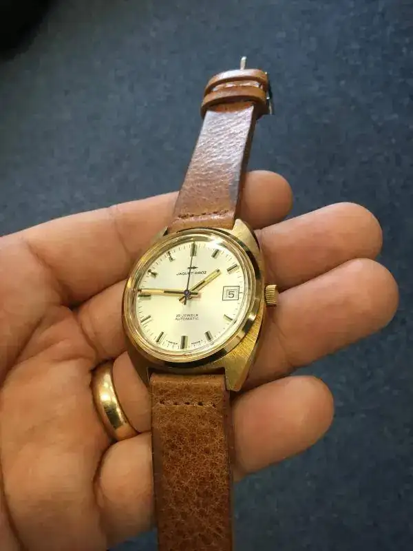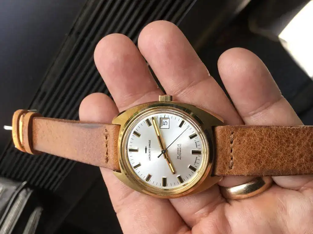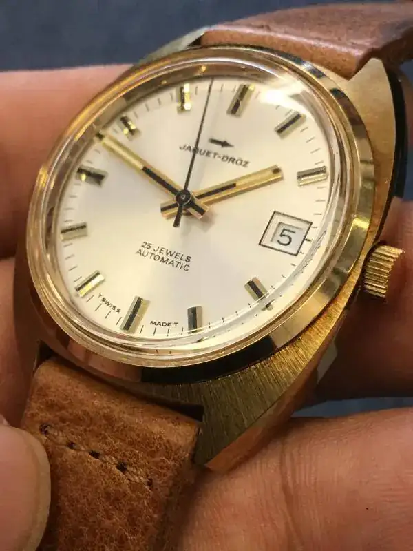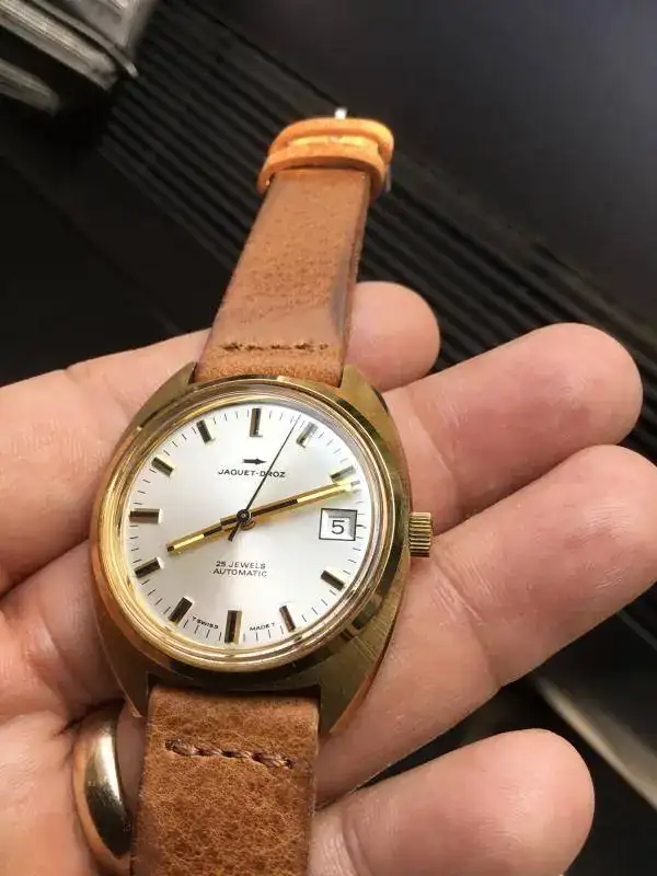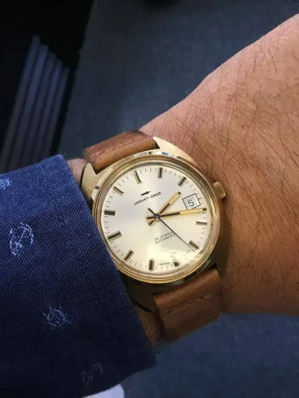 Vendo este peculiar reloj. Se trata de un Jaquet-Droz de los 70's, con caja de 36mm, movimiento automático, fecha, cristal plexi y tritio en la esfera. El calibre late a 21.600 pulsaciones.