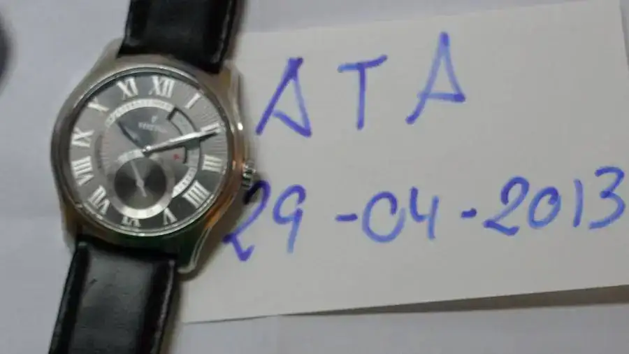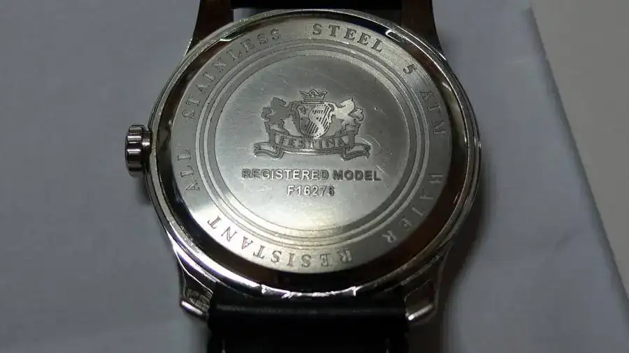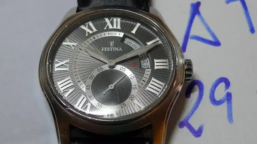 el reloj es de cuarzo y tiene segundero a las 6 y calendario por ventana de 1/4 terminada a las 3.