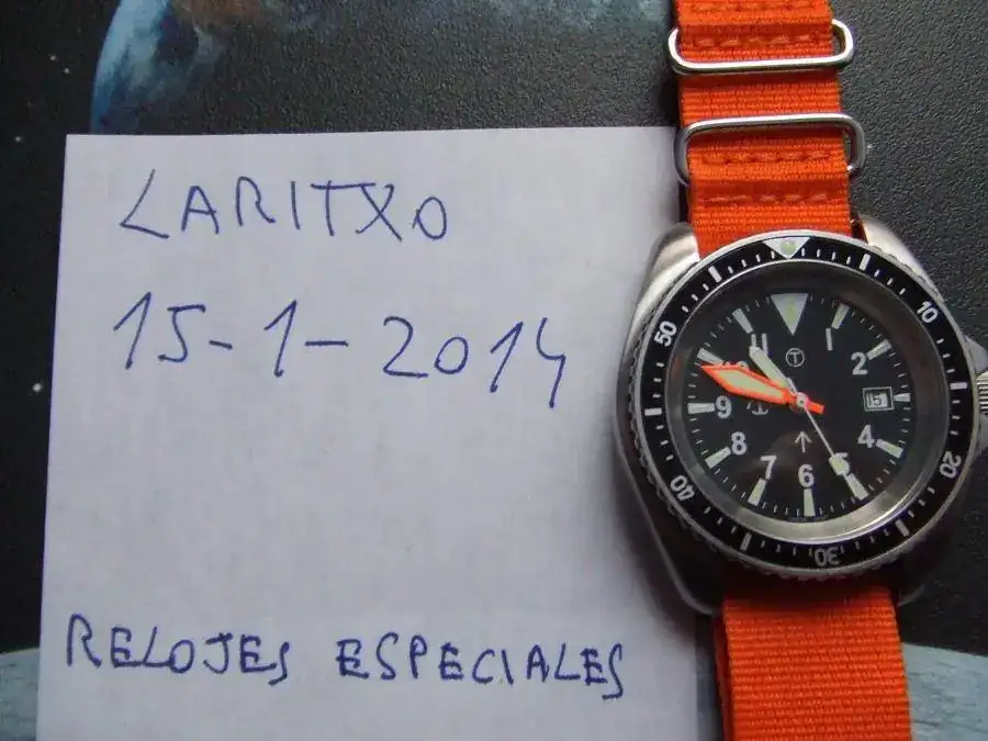 Esfera negra con distintivos militares ,agujas plongueur ,fecha a las 3 corona a rosca y fondo a rosca, caja satinada.