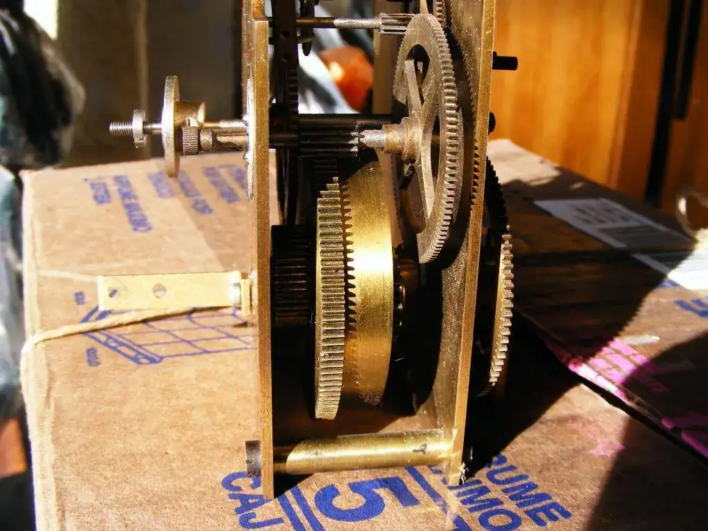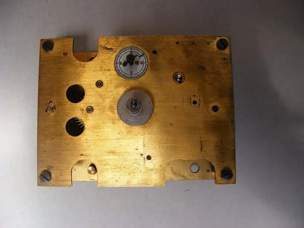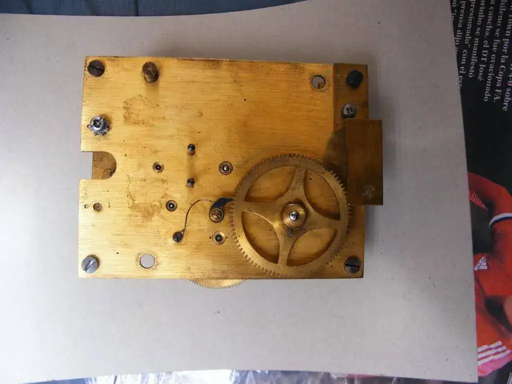 mide la platina de este reloj 95,5 mm por 125,5 mm me parece que tiene solo eje para las horas y una esfera pequeña que me parece que es para los minutos, falta el puente del ancora y los componentes del pèndulo, adjunto foto del frente y posterior y del ancora.