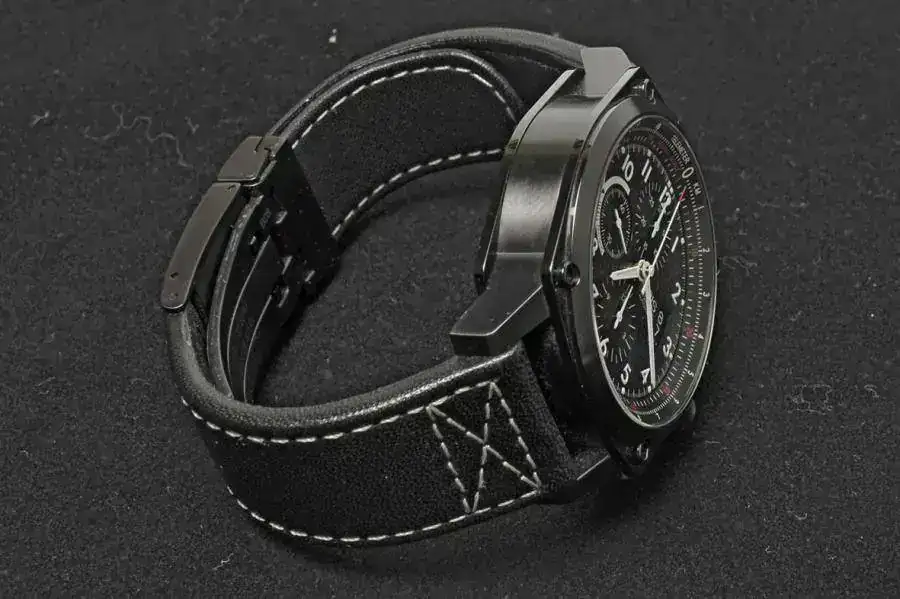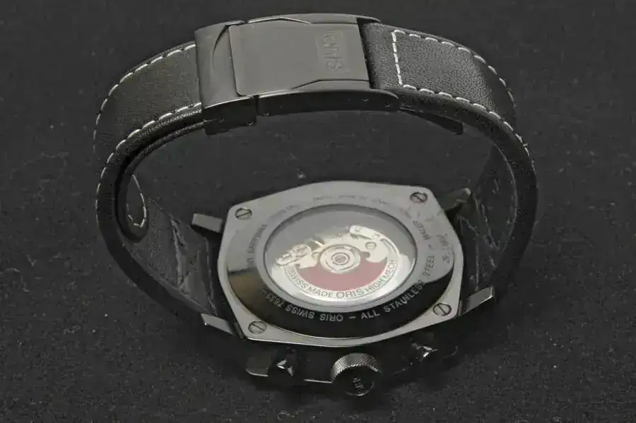 Caja de acero DLC negro (45,00 m/m), movimiento automático "Oris 674" base ETA 7750, pulsera piel negra, con hebilla desplegable DLC negro, cristal de zafiro abombado con antirreflejos en ambas capas, esfera negra con índices y agujas Superluminova , fondo acero inoxidable DLC negro atornillado, corona y pulsadores de seguridad de Oris Quick Lock, resistente al agua 100 metros (10 BAR)