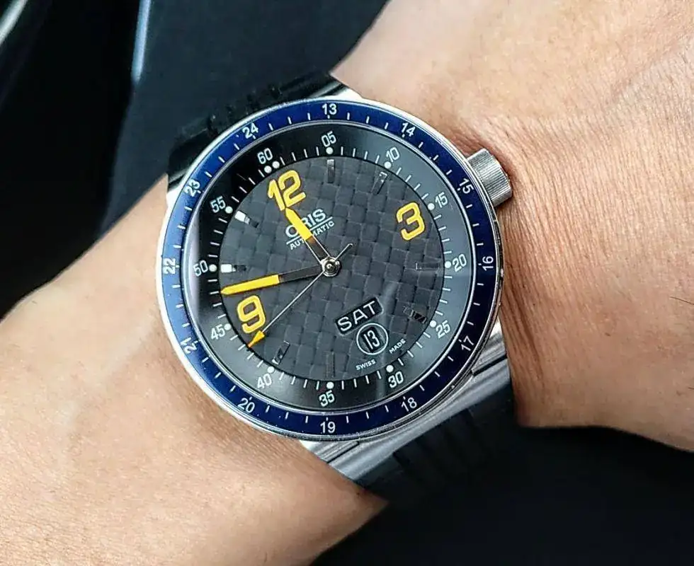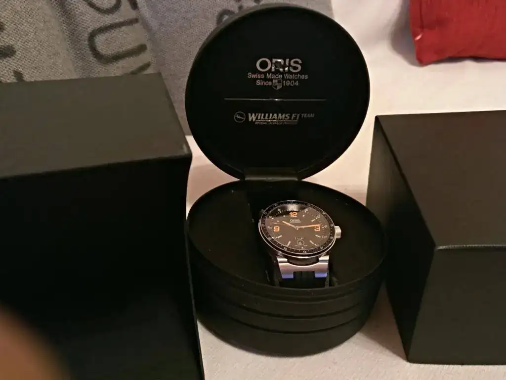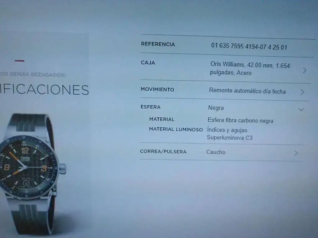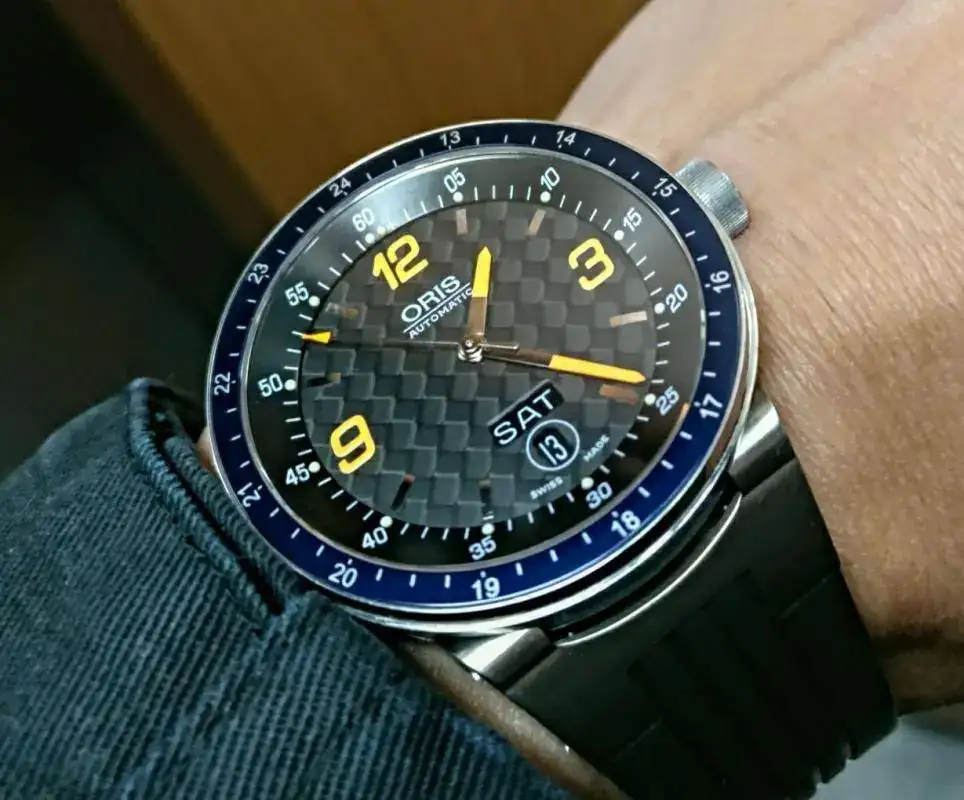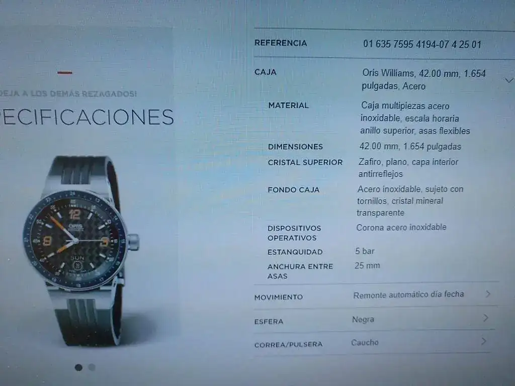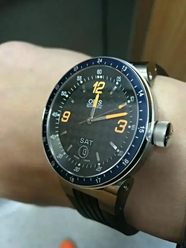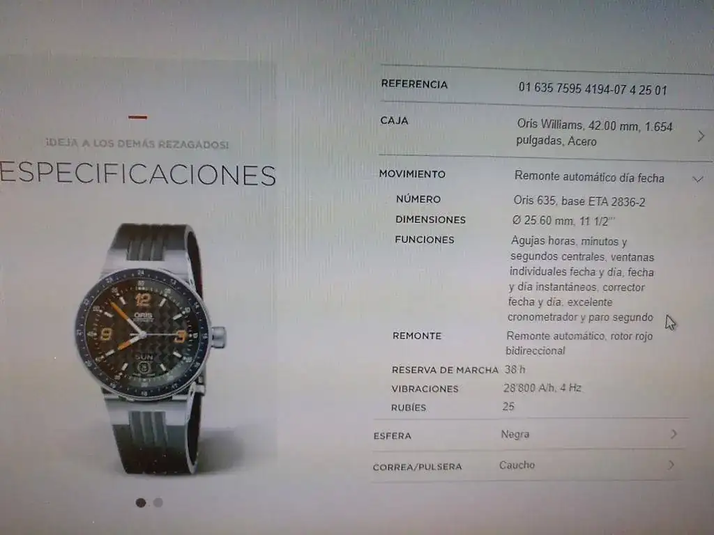 Hola a todos, pongo a la venta este Oris Automático F1 con dial Carbono Day date, Calibre Oris 635 base Eta 2836-2, en buen estado, usado pero sin excesos, buena marcha, cristal de zafiro con anti reflejos interno, 42 mm más corona, admite carga manual y parada de segundero, agujas y marcadores luminiscentes en 2 colores, wáter ressist 5 Atm, correa de caucho con cierre deployante original y como nueva (máximo 18,5 cm, pero hay extensores y correas genéricas adaptadas para muñecas mas grandes por poco dinero) asas móviles como ya sabéis en estos modelos, Precioso, el modelo actual con base sellita (No Eta) marca 1100 euros de PVP. Y sin dial de carbono, además este modelo no trae publicidad de Williams, lo cual, al menos yo agradezco, incluye estuche (el interior un poco deteriorado, habitual en la marca) con sobre caja , no trae documentación pero va muy bien, tiene algunas ligeras marcas de uso, cristal impoluto, en el bisel solo una marquita antes del 13 que pongo en una de las fotos, Saludos a todos y Gracias al FORO, si me proponéis un cambio que sea para no perder yo, Gracias.