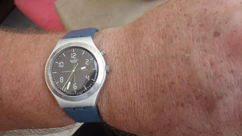 Hoy un Swatch sin chrono , pero con alumbrado espectacular , no hay diferencia dia o noche