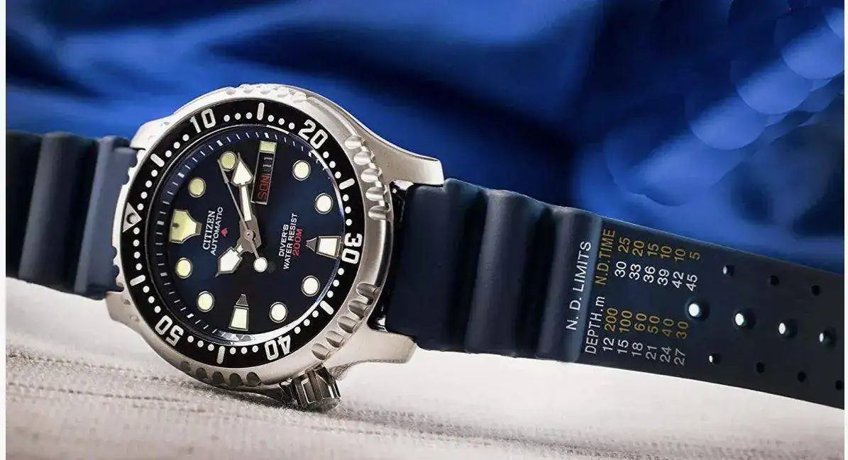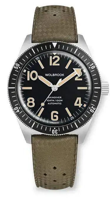 This Skindiver Automatic watches feature Super-LumiNova on dials & indices, a sapphire glass and a steel case - water resistant to 150m. These automatic watches - powered by the Japanese automatic movement Citizen 8315 - are presented on "Tropic" straps or beads of rice bracelets.wolbrook.com