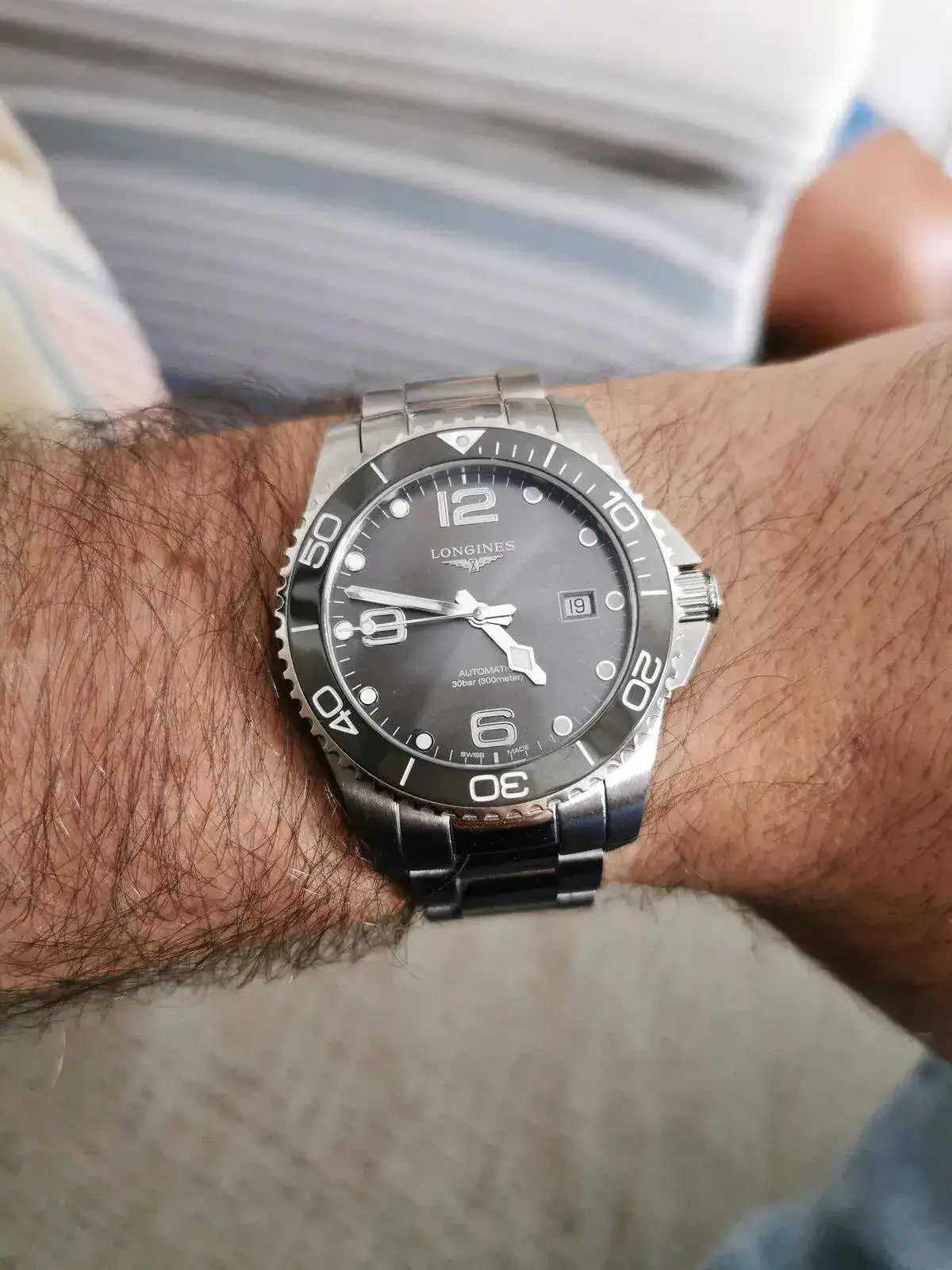 Te pongo una foto del mío para que tengas una referencia. Mi muñeca es de casi 19cm.El Hydro me lo probe hoy en 41mm y me pareció bastante cómodo y adecuado, el Oris igual aunque me probe el Calibre 400 que es el que tenían, se que a Oris lo ponen muy bien aunque a mi no me termina de convencer ese diseño de brazalete integrado.