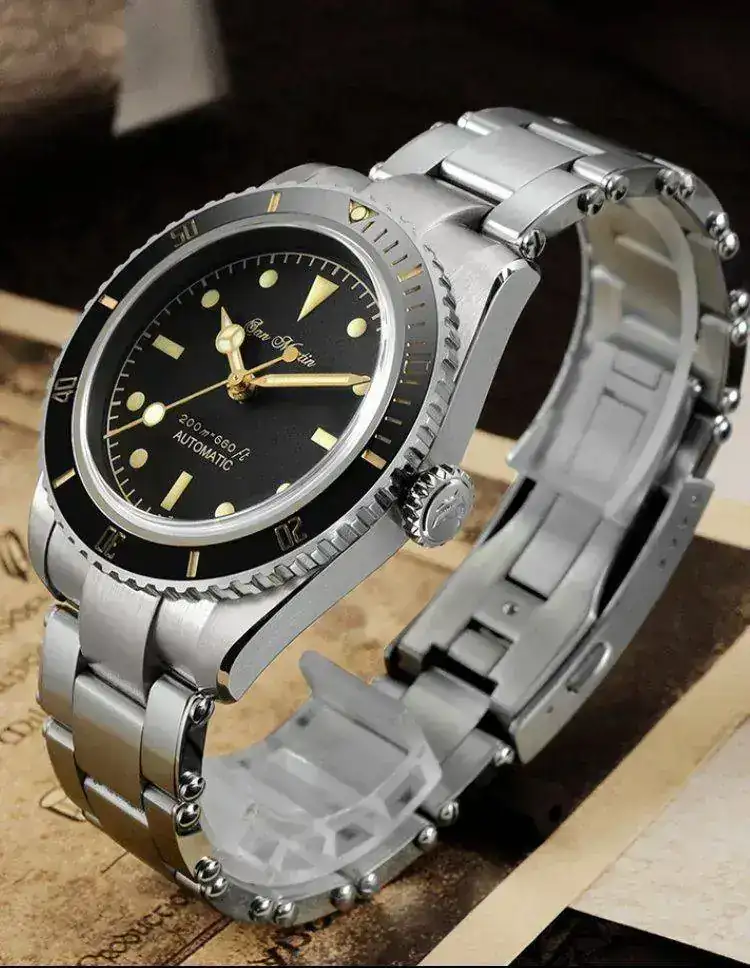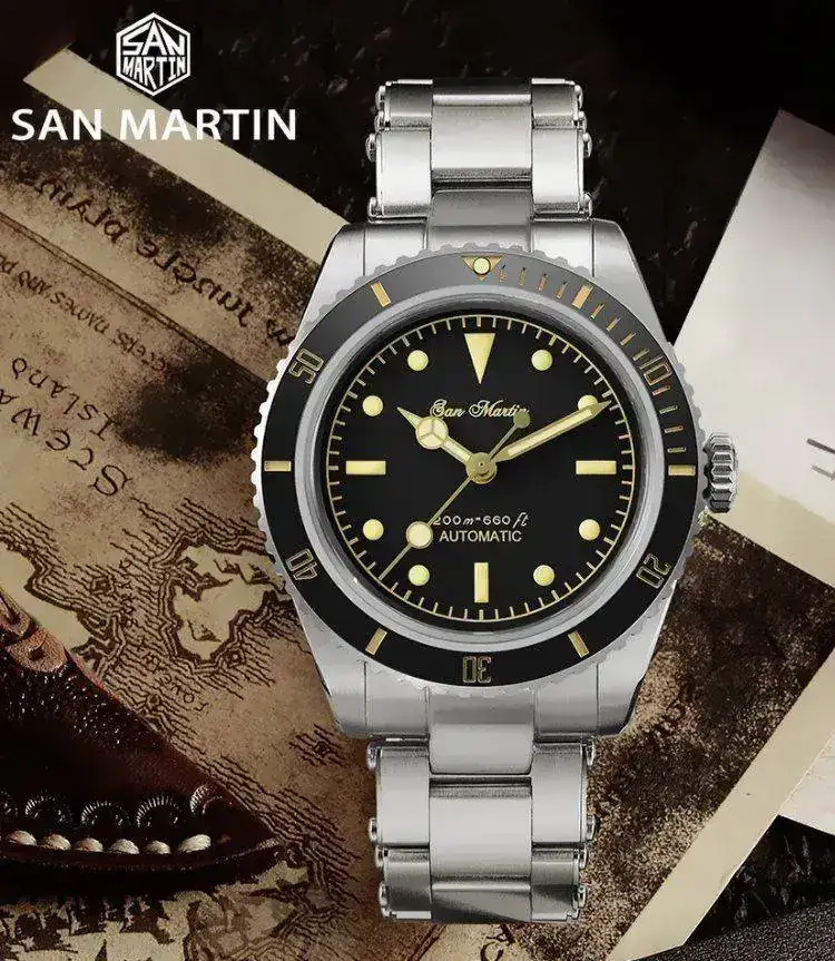 San Martin modelo 6200, calibre Seiko Nh35, zafiro, 200m de agua y una estética retro como la del primer submariner que es guapísima. Además por unos 20 euros puedes mandar personalizar la esfera: poner tu nombre, el logo que quieras etc.