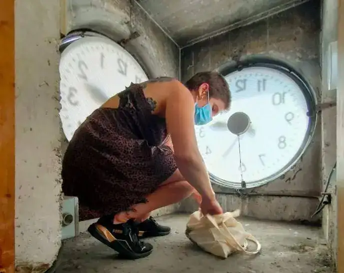 Y esta es su nieta que nos enseña el estado actual del hueco en el que su abuelo se escondió junto con el propietario de la vivienda al cual también buscaban, como se puede apreciar el mecanismo ha sido sustituido por maquinaria eléctrica, descononozco cuando ni que tipo de maquinaria llego a tener pero se puede apreciar que dos personas pueden entrar sin problemas,,,