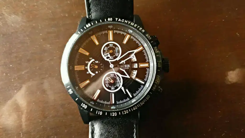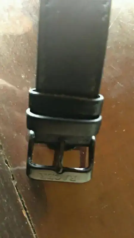 lleva una correa de piel antialergica con hebilla firmada, 50 m WR, cristal mineral reforzado, marca grabada en la esfera, corona y tapa trasera. no tengo ni caja ni papeles, pero lo envio en una caja y debidamente enbalado.