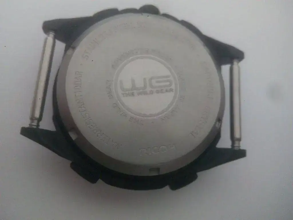 Es un reloj de la marca RICOH de toda la vida pero con un sistema de carga muy especial; tiene una batería recargable que se usa poniendo el reloj sobre un puerto de carga. Una carga completa dura un mes aproximadamente de uso moderado. Para un uso normal, a mí me ha durado casi tres.
