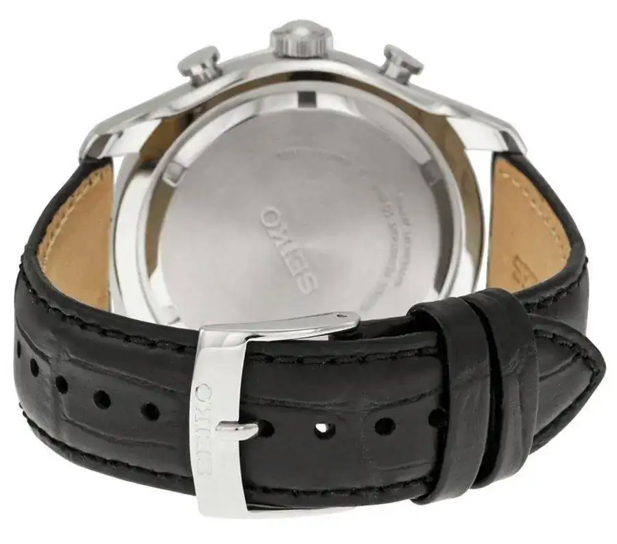 Correa de cuero negro con hebilla Seiko.