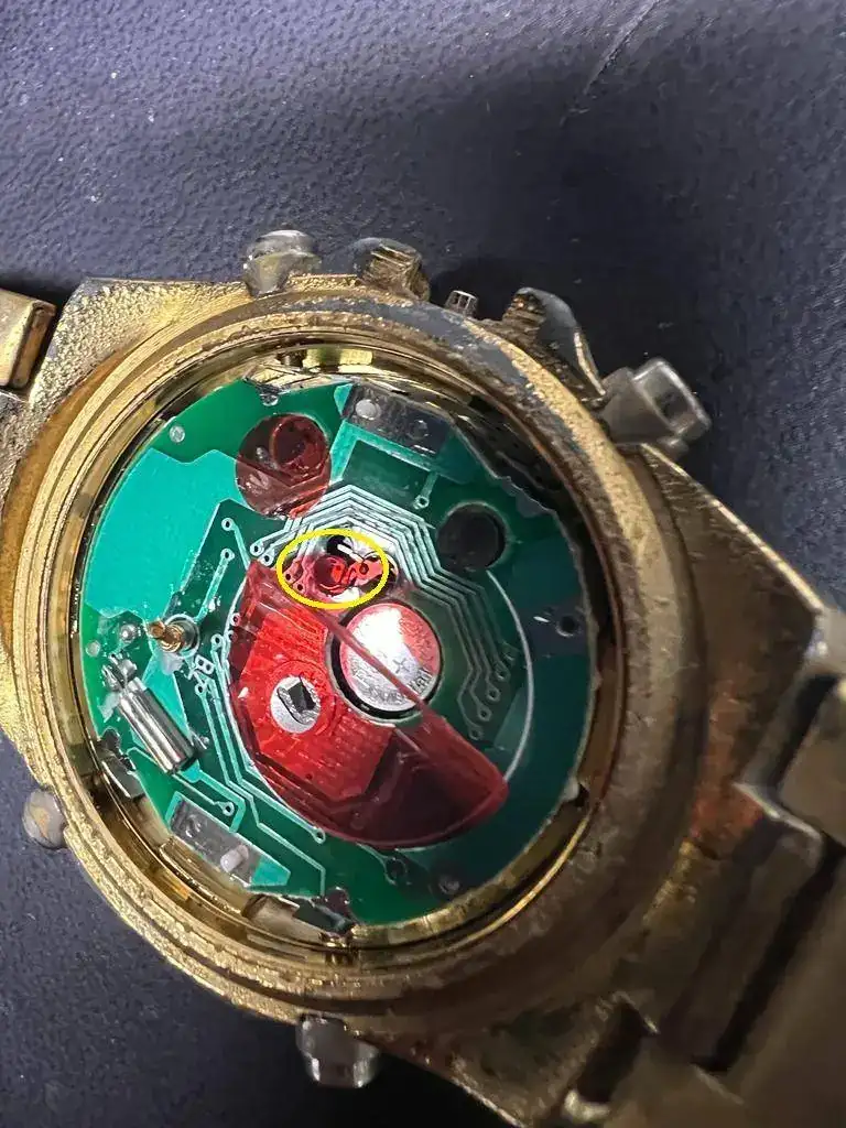 Y quien soy yo para decir al cliente que no? entonces ya lo tengo desarmado....curioso para ser un reloj chino la calidad dentro de su segmento esta bastante bien.....para llegar a quitar la tija tuve que quitar lamina blanca para poder llegar al punto del tirete (marcado en circulo amarillo y sacar la tija para desmontarlo completo....
