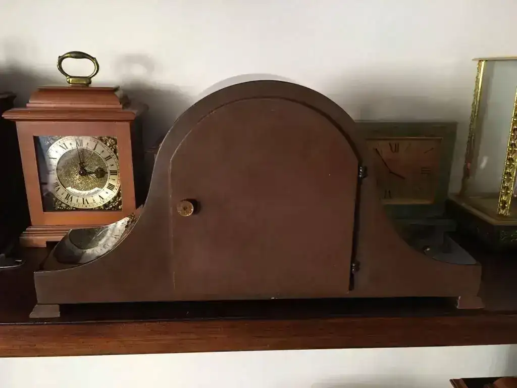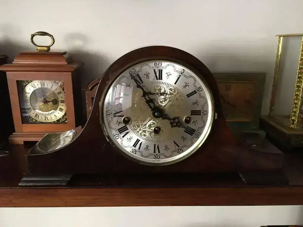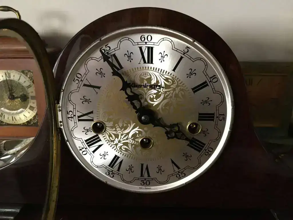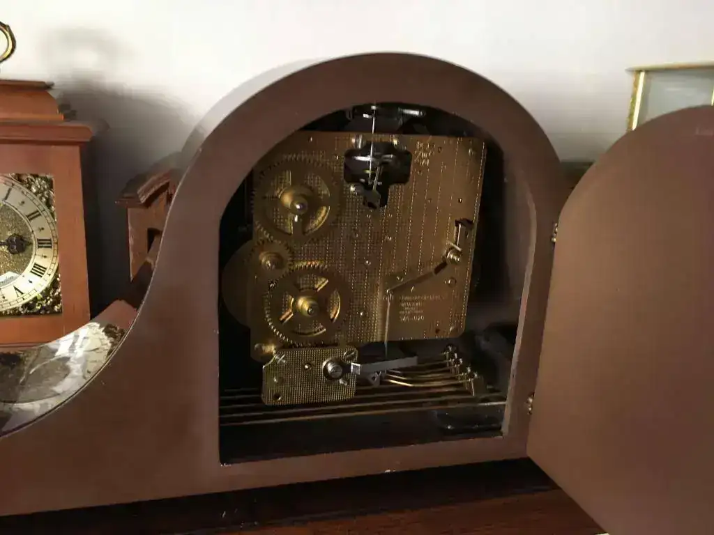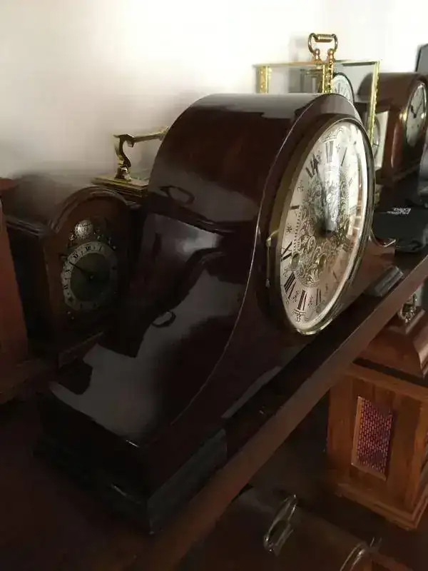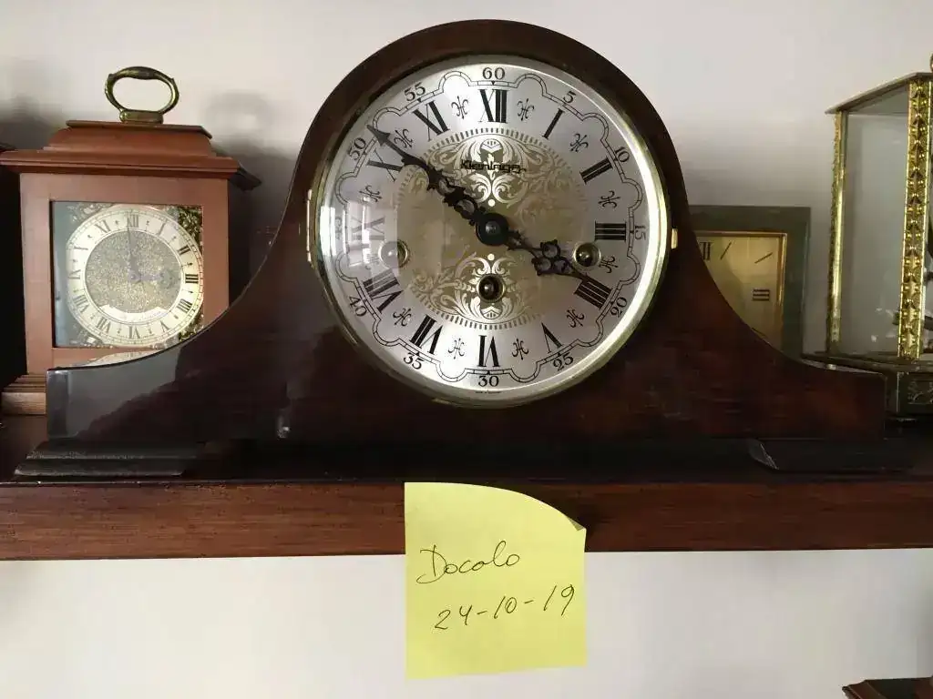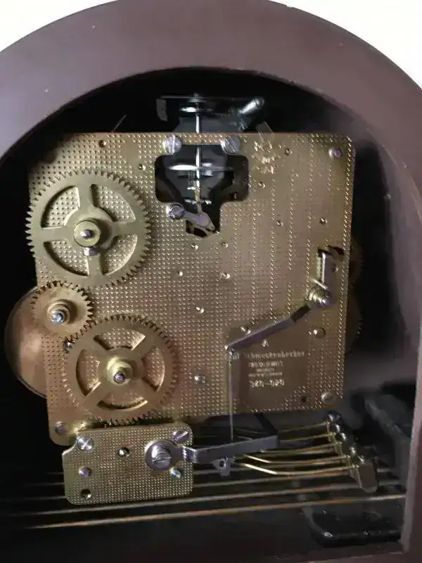Reloj de sobremesa fabricado en Alemania. Maquinaria Hermle carrillon tocando todos los cuartos y las horas con la melodía Westminster. maquinaria mecanica de cuerda de 8 dias con escape flotante de espiral plano de ultima generacion, limpia y aceitada . mueble en madera de nogal, mide 37x19cm. Estado y funcionamiento excelente. solo 125€ con envio incluido por mensajeria.