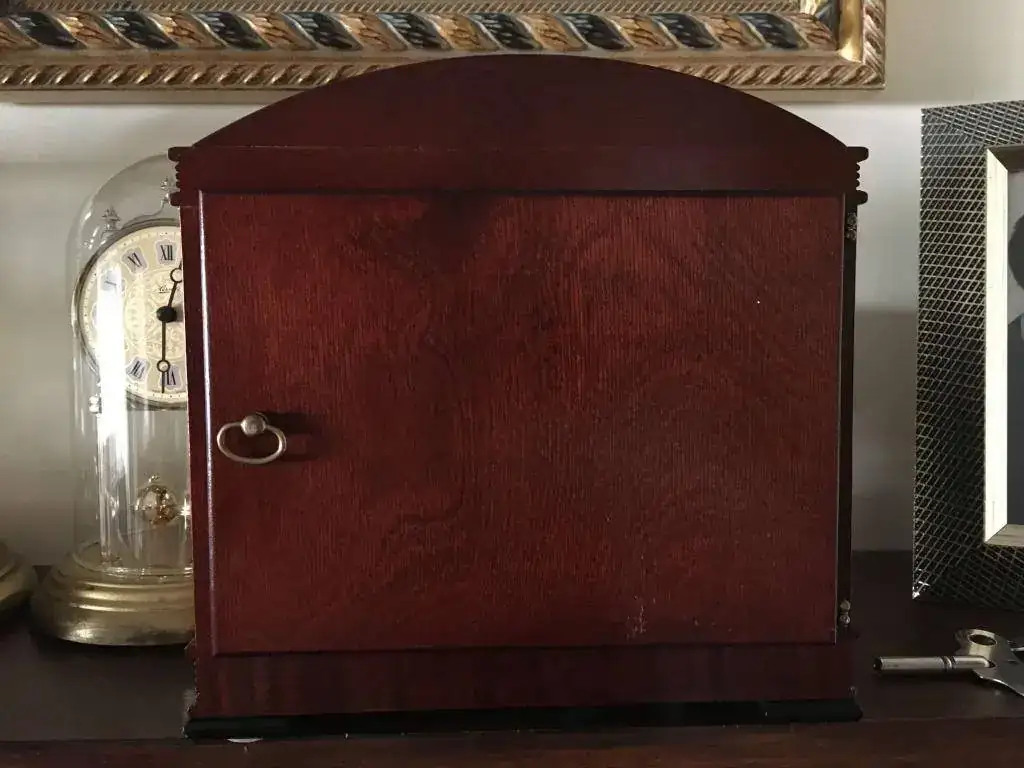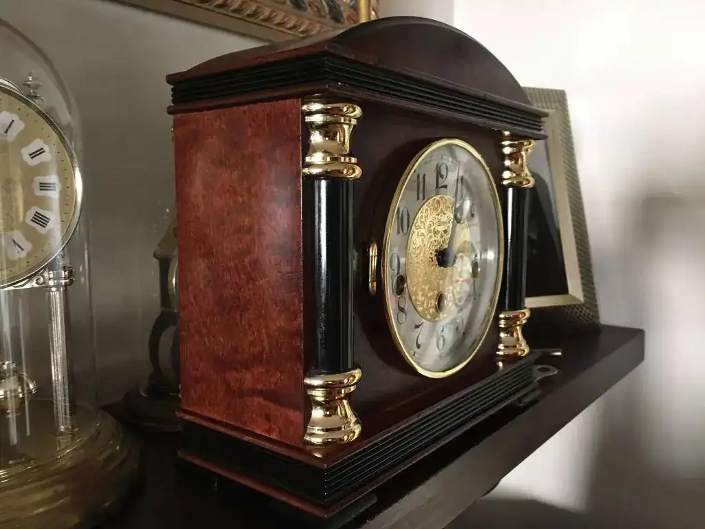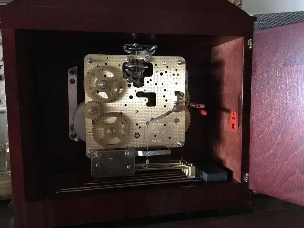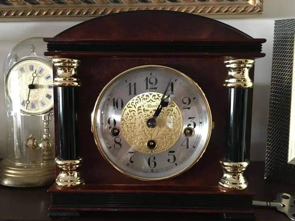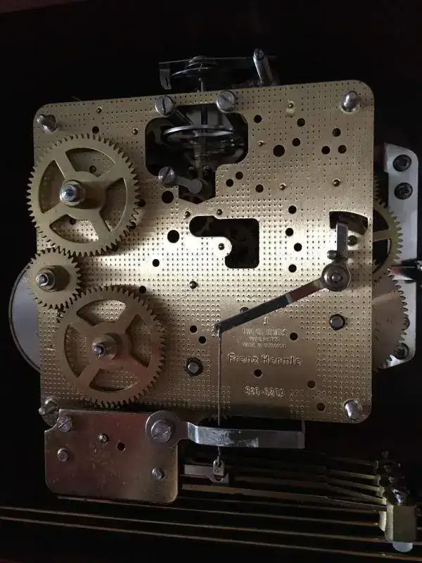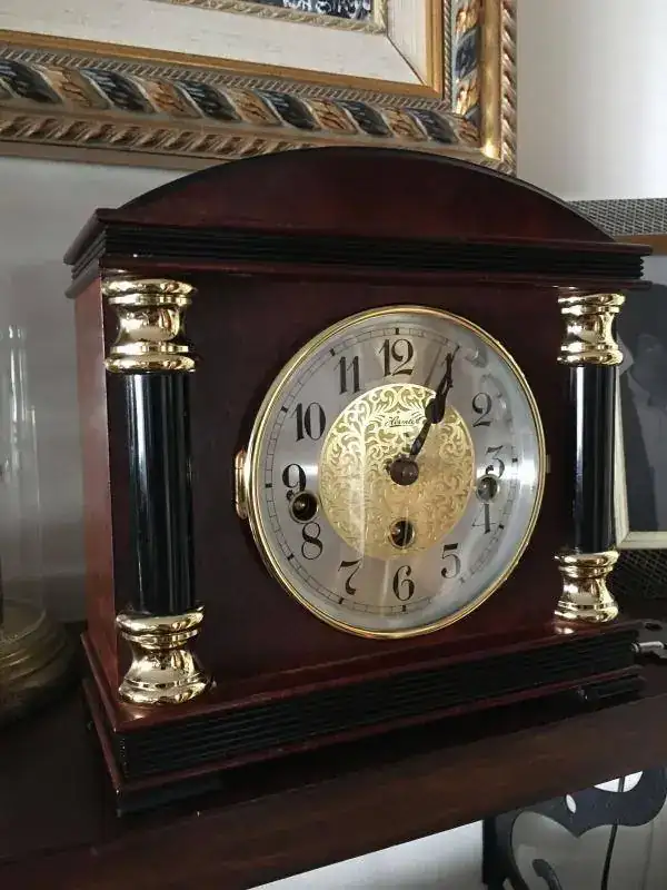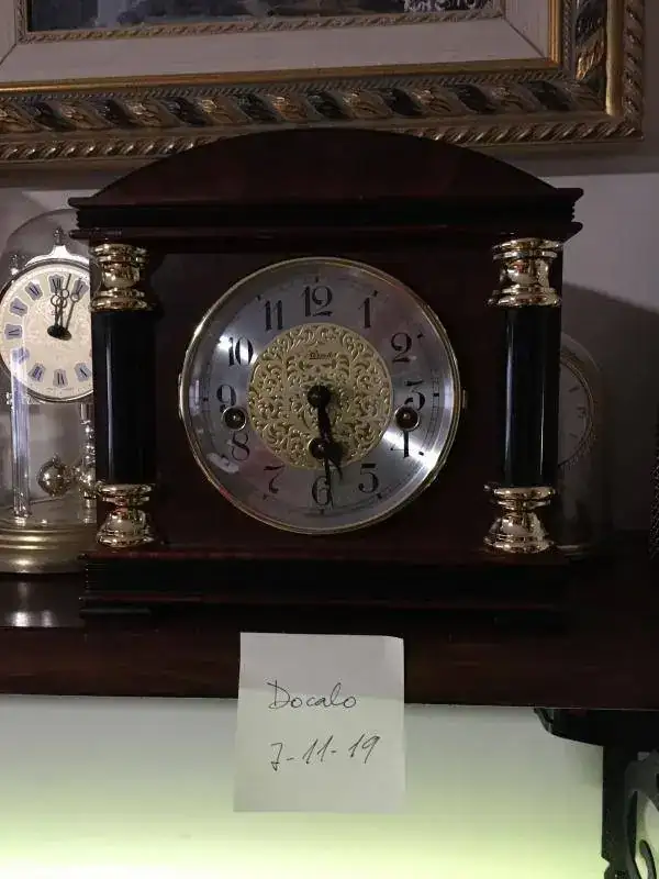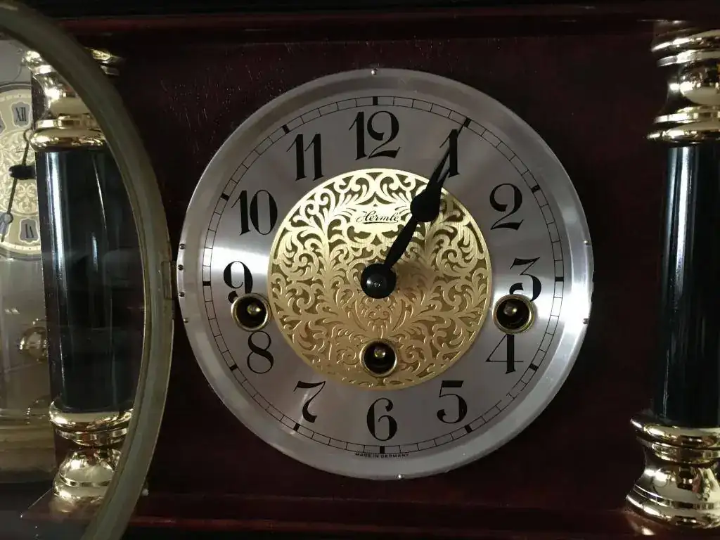 Reloj de sobremesa fabricado en Alemania por Hermle en 1997. Maquinaria mecanica Hermle carrillon, tocando todos los cuartos y las horas con la melodía Westminster, palanca para desconexion de la soneria, escape flotante de espiral plano de ultima generacion, mueble en madera de nogal que mide 23x23cm. Estado muy bueno y funcionamiento excelente, solo con pequeños roces (ver fotos). maquinaria revisada y aceitada.