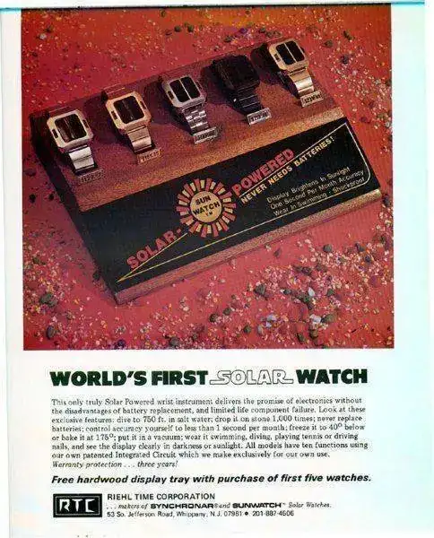 El primer reloj de pulsera con energía solar del mundo fue inventado por Roger William Riehl, un experto en electrónica y autodidacta. Él lo bautizó con el nombre de Synchronar, la “palabrita” fue creada a partir de algunas letras de los siguientes términos; SYNchronous, CHRONometer y calendAR.