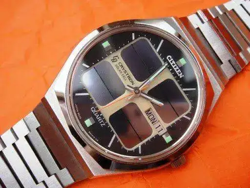 El próximo hito en la evolución del reloj solar sería la introducción del Citizen Crystron en 1976. Es el primer reloj solar con pantalla analógica. Era tradicional en apariencia, pero tiene una gran variedad de cuatro paneles solares en el centro de la esfera.