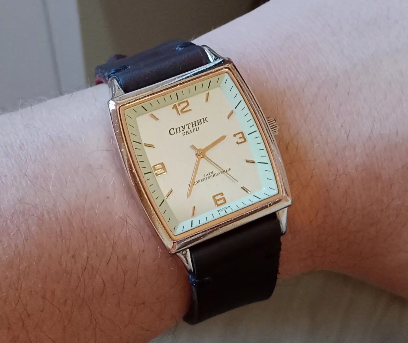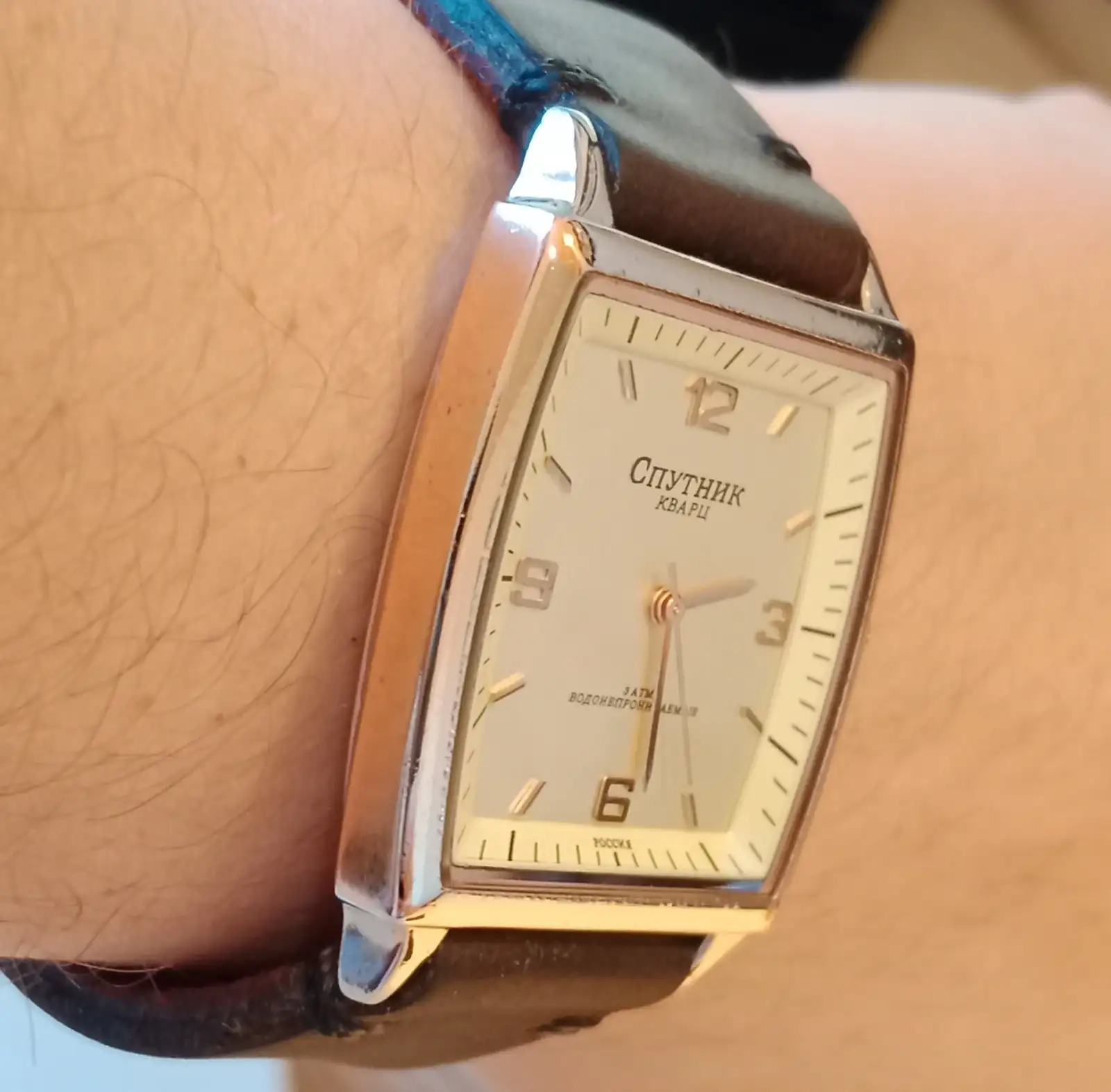 es un cuarzo chusquero, no muy viejo, desde luego posterior al CCCP. funciona y curiosamente el cristal está casi nuevo. lo dejo aquí a modo de curiosidad:
