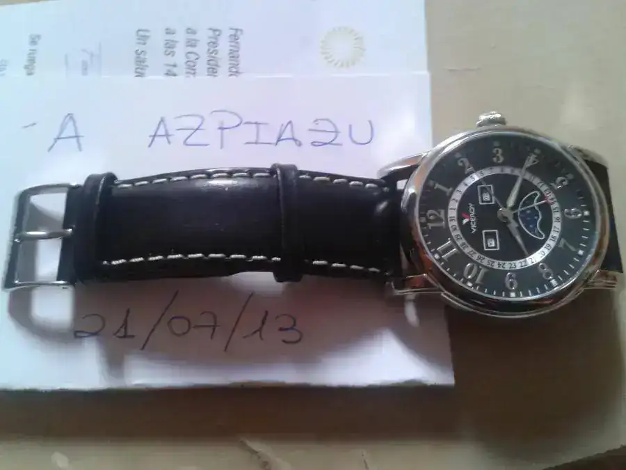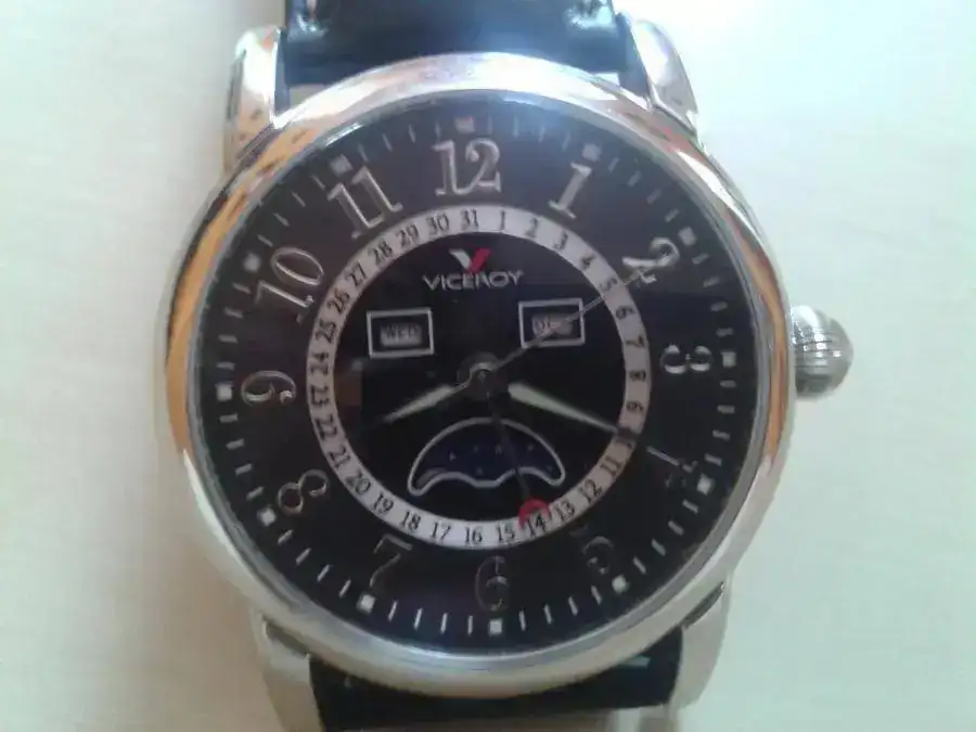 El calibre debe de ser un cuarzo japo,pero no lo he abierto para comprobarlo.La pila está recién terminada.Tiene multifunciones: Año y mes en los recuadros de la esfera.Calendario lunar en el recuadro de la esfera de encima de las seis.Día del mes mediante una cuarta aguja que marca el día en un circulo interior.