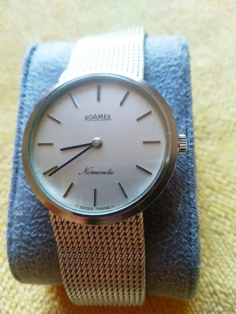 Roamer Normandie de principios de los años 70, de la serie que hizo Roamer con ciudades y lugares de Francia. Monta un calibre Peseux 7001 y sigue la moda de la época de la milanesa integrada en la caja.