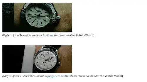 Lo de Travolta con Breitling no es casualidad, al parecer era ( o sigue siendo ) embajador de la marca, en más de una película se le ve con relojes de esta marca, además como dato curioso el mismo se pilota sus propios aviones ( tiene varios ) , no necesita contratar a ningún piloto profesional.