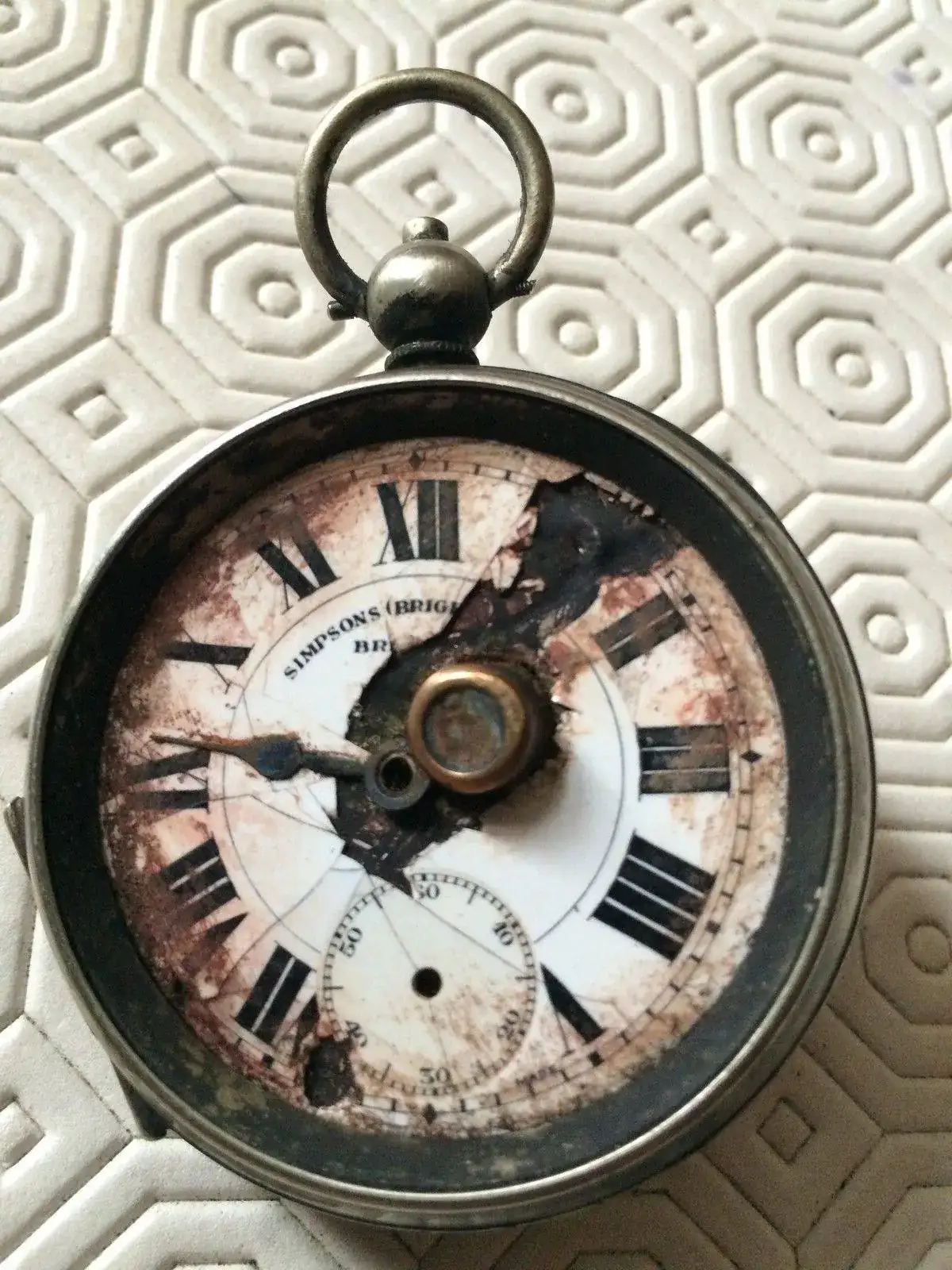 El siguiente reloj es un Stop Watch que no estuvo expuesto, porque ese día el dueño lo dejó en su casa, que estaba a varios kilómetros. Forma parte del museo aunque no sean visibles deterioros ocasionados por el estallido.