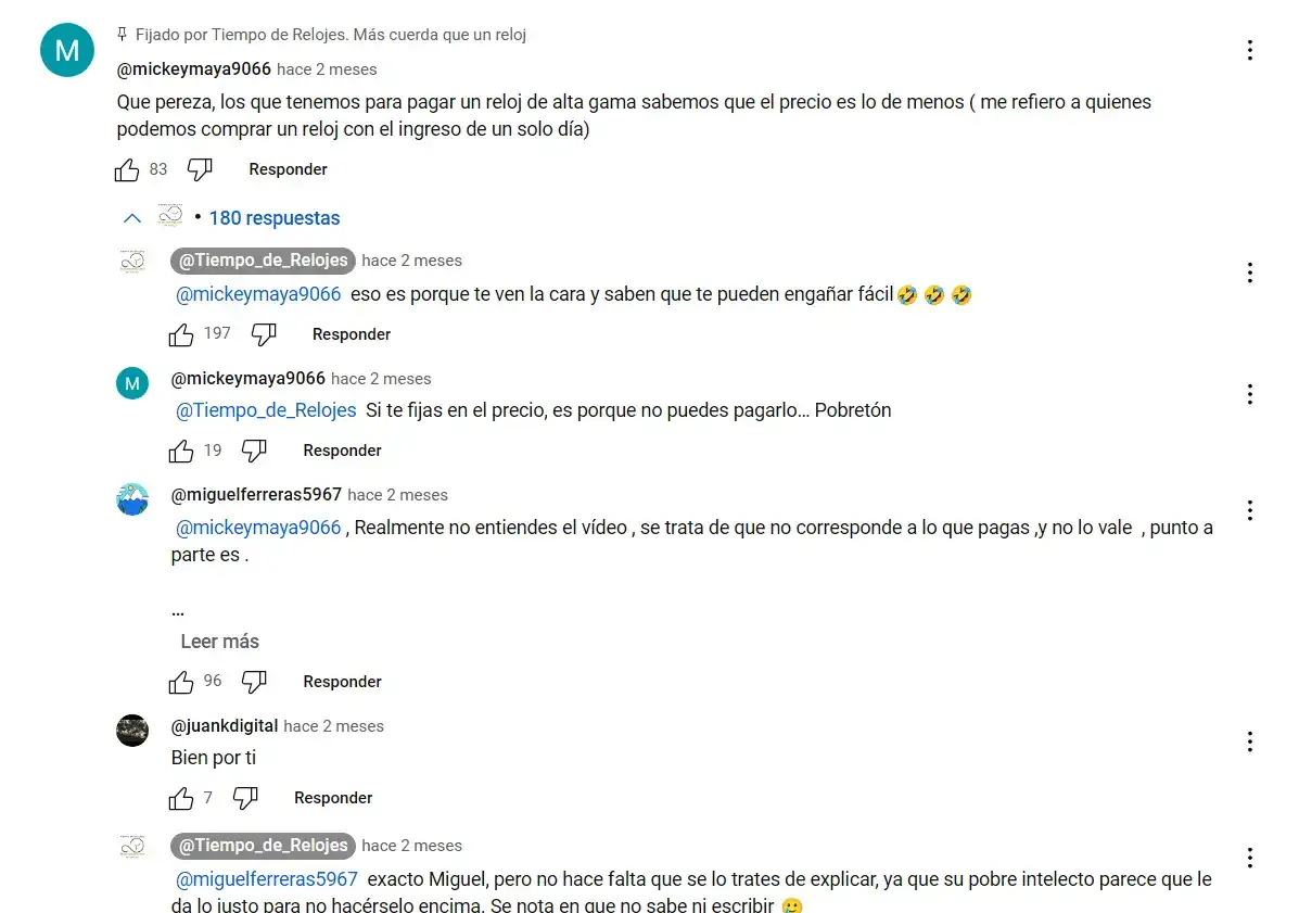 Sin duda peca "de sobrado". Pero al final no deja de ser un comentario más de alguien random, al que el dueño del canal no puede entrar a responder de esas formas. Y he mostrado solo parte, que hay más. El youtuber responde desde "otra posición", no puede bajarse al barro de esa manera porque le resta seriedad y no hace más que dejarle en un muy mal lugar.