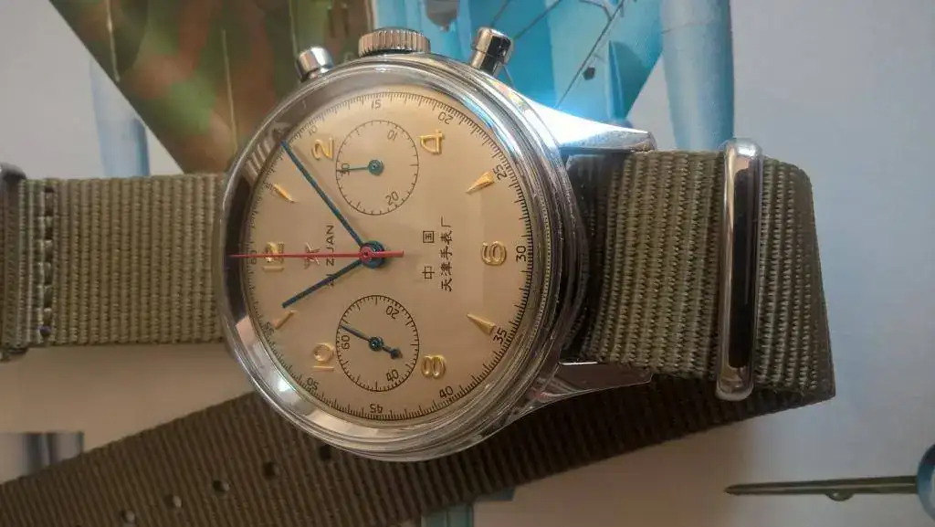 Todos sabemos que se trata de una reedición de un reloj que dotó a los pilotos del ejército chino en los 60. En las fotos precedentes, está fotografiado sobre fotos de un Nancheng A-5 (versión china del Mig-19). Es probable que este reloj volara a bordo de este tipo avión.