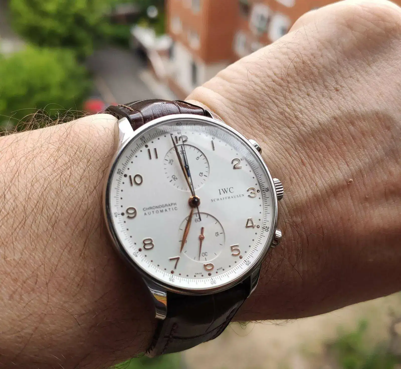 - Un IWC Portuguese con esfera blanca, numerales dorados y correa marrón oscura: