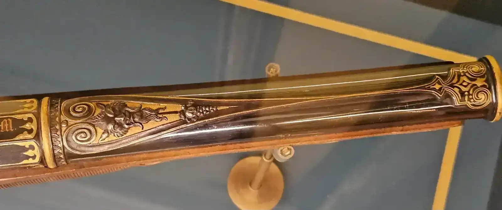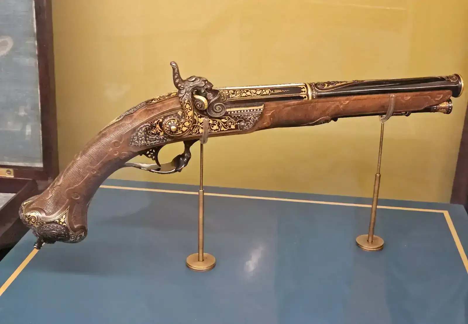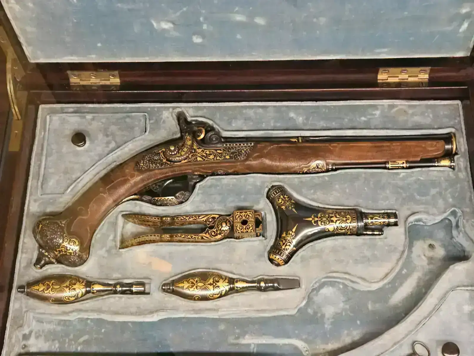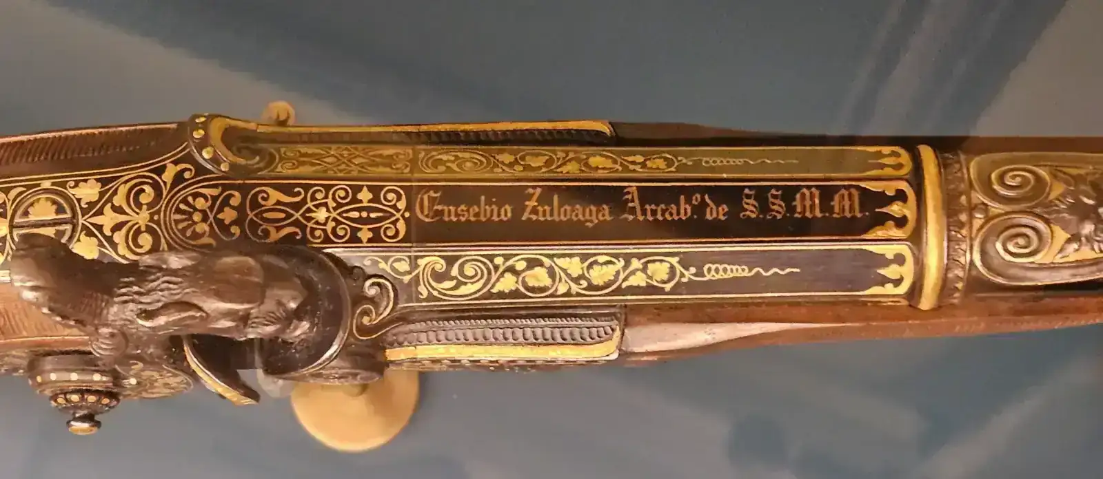 Se trata de un par de pistolas de duelo de Eusebio Zuloaga, el mejor acabucero real de la época, iniciador del arte del damasquinado moderno y además con fama internacional. Si no me equivoco el Estado pagó a un coleccionista privado 150 mil euros por estas