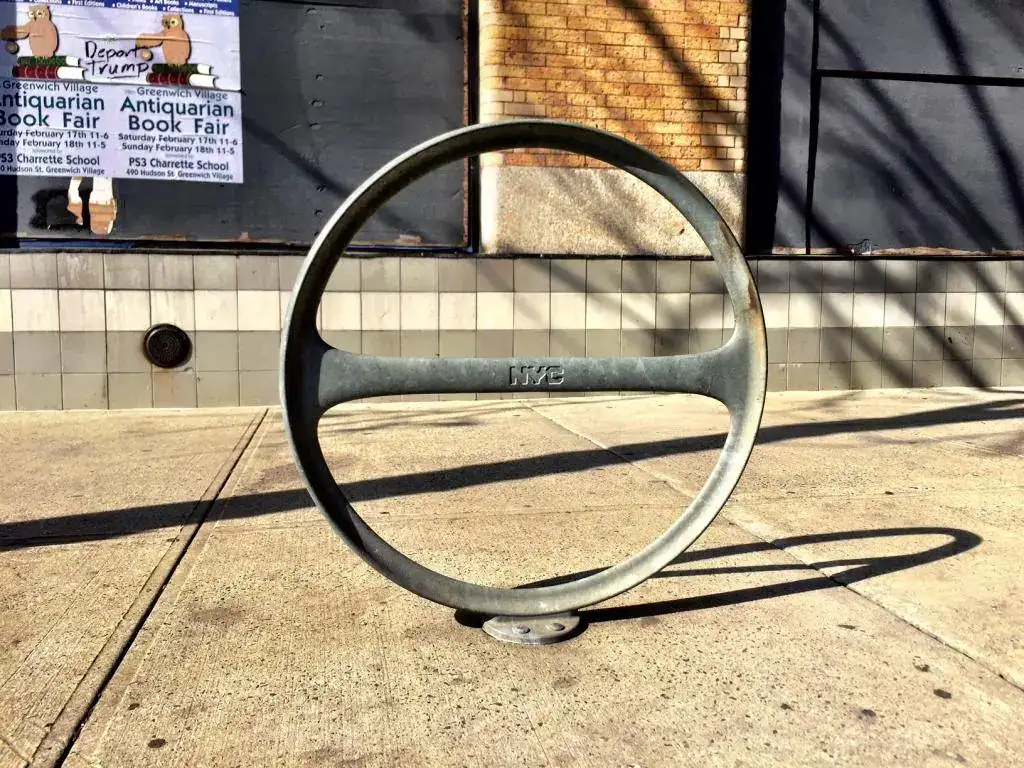 Pasamos por Canal Street, esa donde los turistas compra sus fakes. Es gracioso, porque en las esquinas te encuentras mujeres maduritas susurrándote "watches, watches..." juer, qué susto. No saqué fotos de sus escaparates porque eran más bien lamentables. Supongo que me perdí algo bueno por no hacerles caso... Lo que no me perdí fueron los "aparcabicis": ¿Se parecen a volantes de calibre o son manías mías?