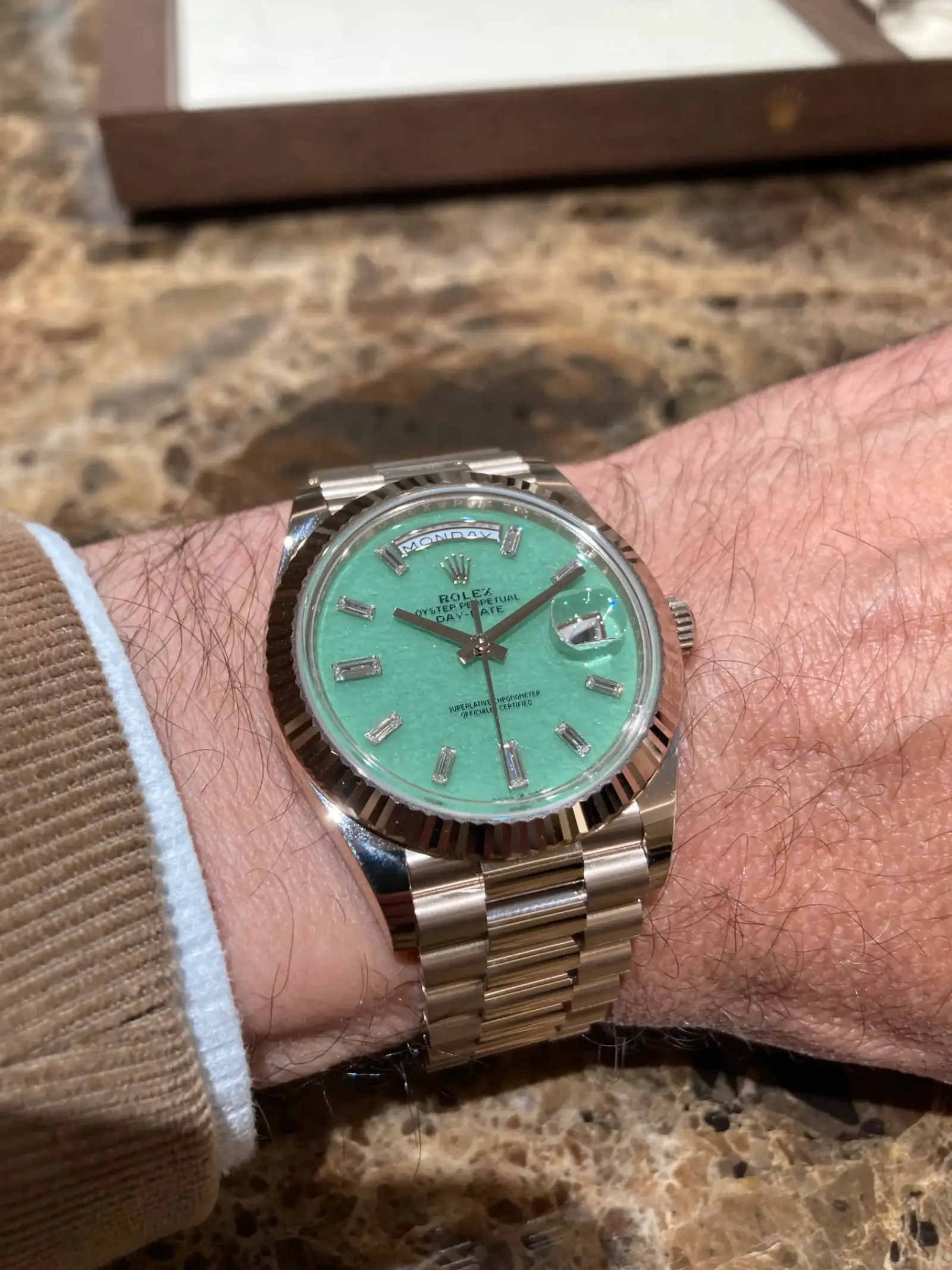 Rolex ha sacado un oro de aleación propietaria (ya sabéis que tiene su propia fundición) que es más pálido de lo que acstumbramos a ver, haciendo al reloj más discreto (todo lo discreto que pueda ser un reloj con diamantes en la esfera, je)