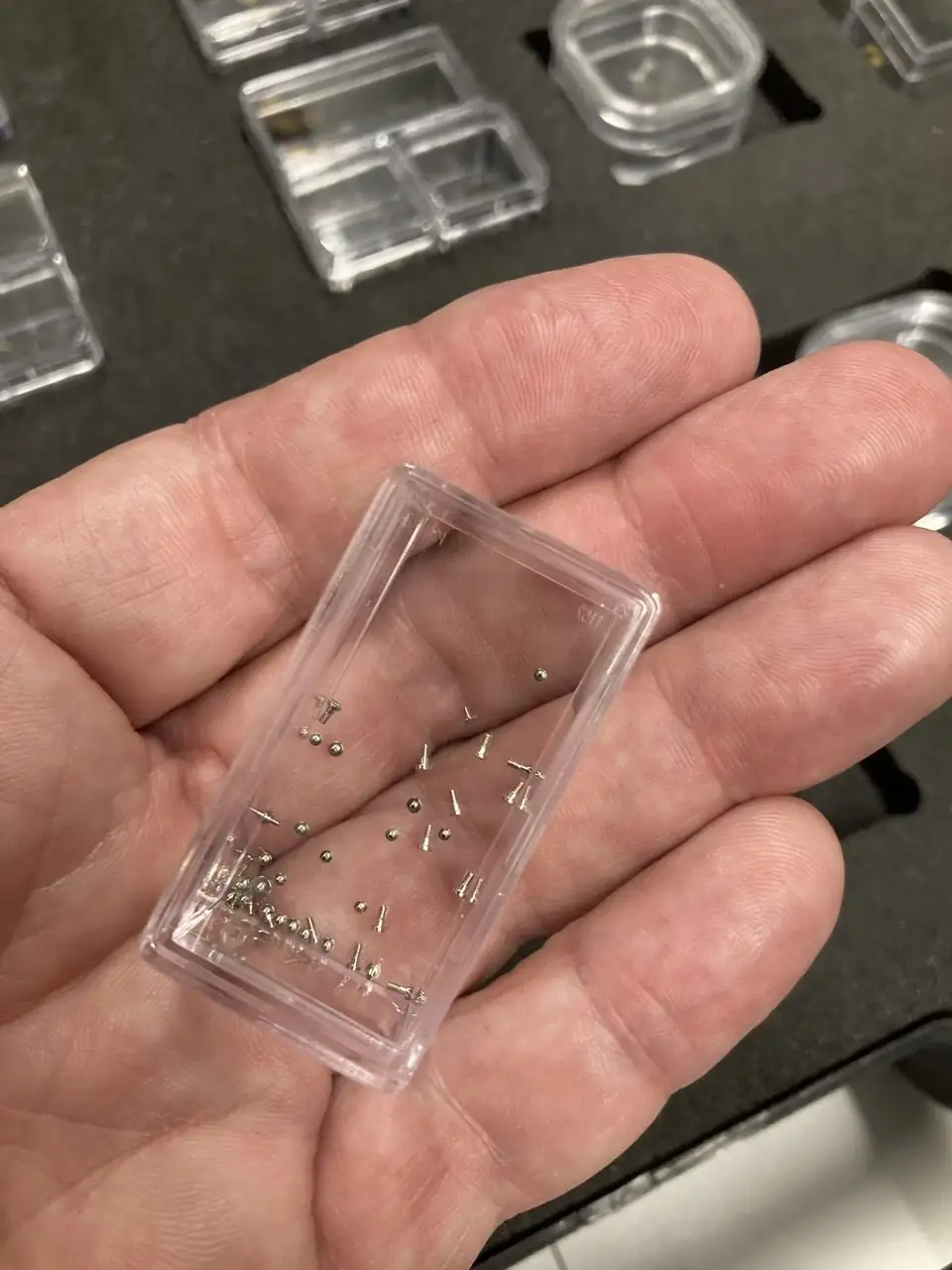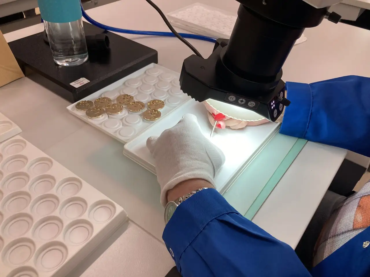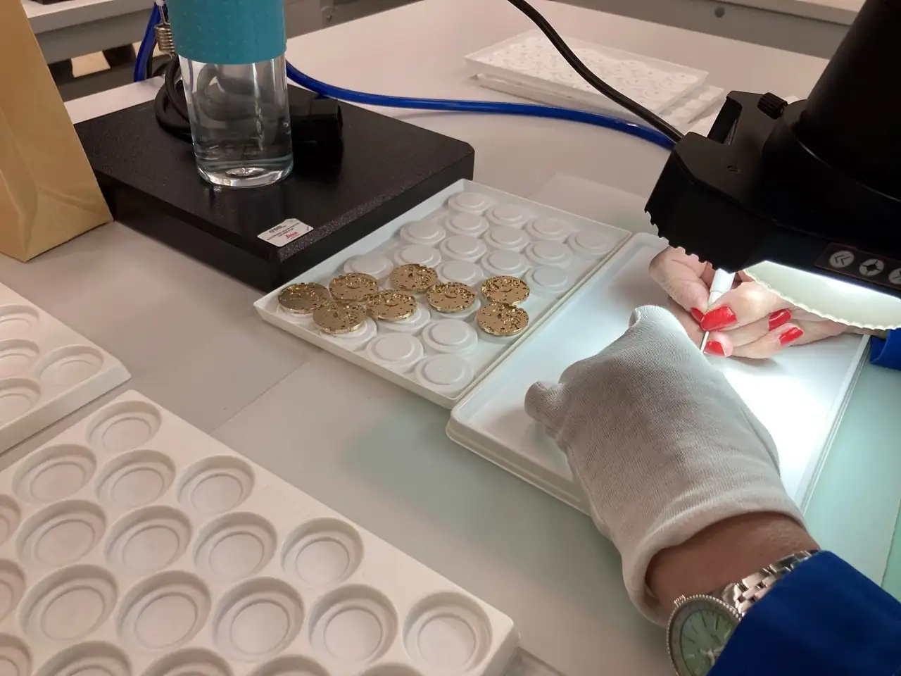 Para los que no lo sepan, los rubíes "tienen mano". Es decir, que no son simétricos y hay que posicionarlos de una forma determinada. Y esta labor se puede hacer de forma automatizada (con una máquina que implica un rudimento de inteligencia artificial para identificar la posición) o se puede hacer manualmente con unas pinzas...