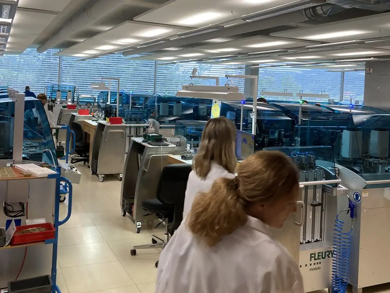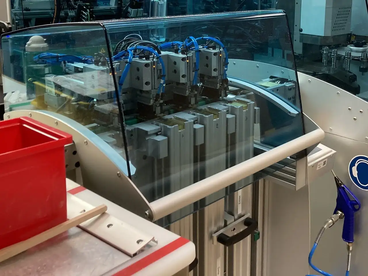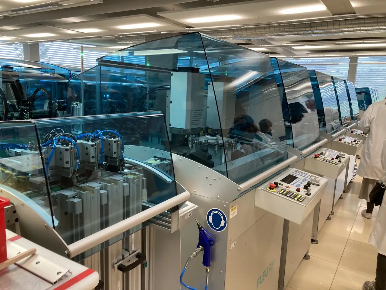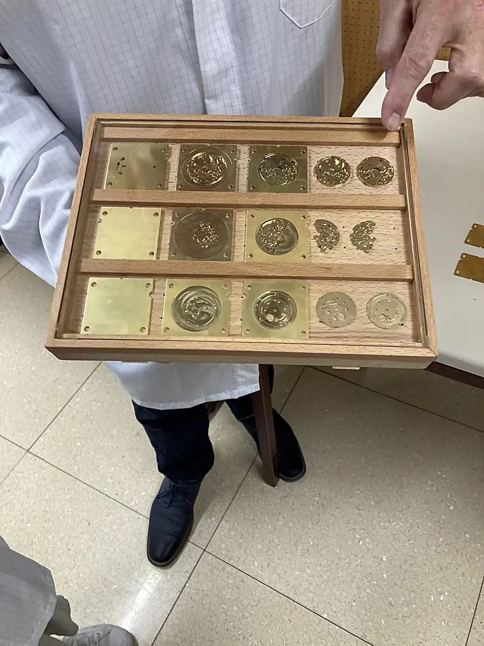 Máquinas, muchas máquinas. Suizas, por supuesto. Y de última generación. Me llamó la atención la ausencia de aceite en el proceso de fresado, ya que este fluido es esencial no solo para lubricar sino también para refrigerar tanto brocas como el material trabajado, algo que he visto en todas (ahora casi todas) las manufacturas que he visitado. Nos explicaron que el motivo es una nueva generación de máquinas que trabajan de forma contínua alternando las brocas (también especiales) a una frecuencia determinada que evita el sobrecalentamiento y por tanto hace innecesaria la refrigeración. Al no tener que separar/lavar las virutas resultantes son mucho más fácil de manejar y reciclar. Algo, el reciclaje y la sostenibilidad, en lo que Breitling se ha comprometido muy seriamente y en lo que tiene que ver también el estuchado de los relojes, mucho mas ecológico... independientemente de la percepción del cliente, que a buen seguro echa de menos esas maravillosas cajas de baquelita.