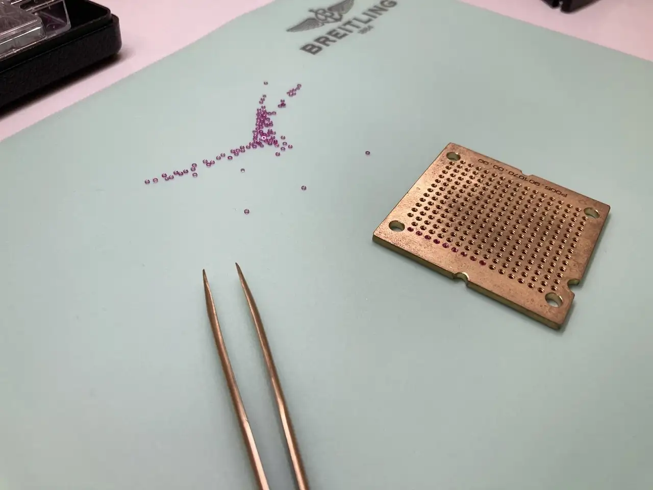 El arenado de la pletina y puentes se hace disparando polvo de latón sobre ellos. Esto los deja preparados para pasar un proceso de galvanizado que les dará el color plateado más habitual. Debido a implicaciones medioambientales, Breitling tiene externalizado esta operación.