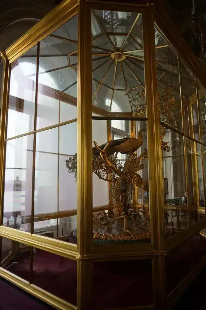 Este otro reloj, ya con una elaboración grandiosa, está en el Palacio de Invierno (actual Museo Hermitage), y fue adquirido por Catalina la Grande en 1781 al joyero inglés James Cox. Es preciosa la armonía de su mecanismo interno con los elementos externos, que parecían de pan de oro. Una fantasía de la naturaleza.