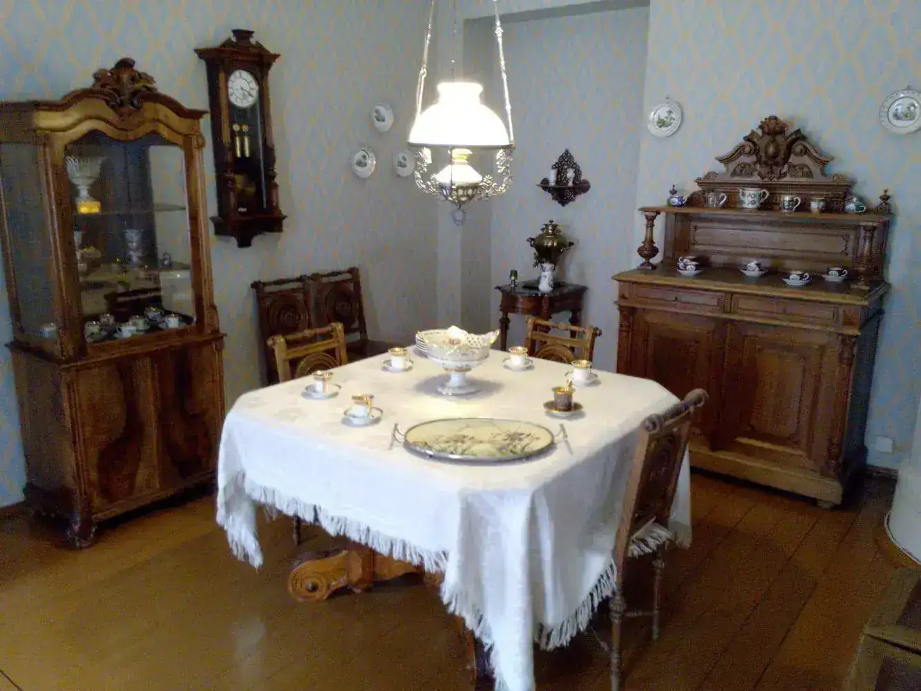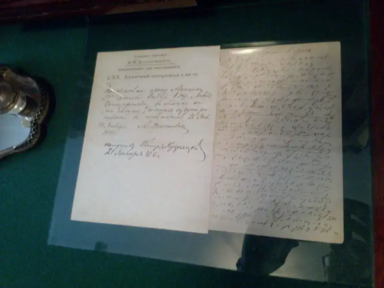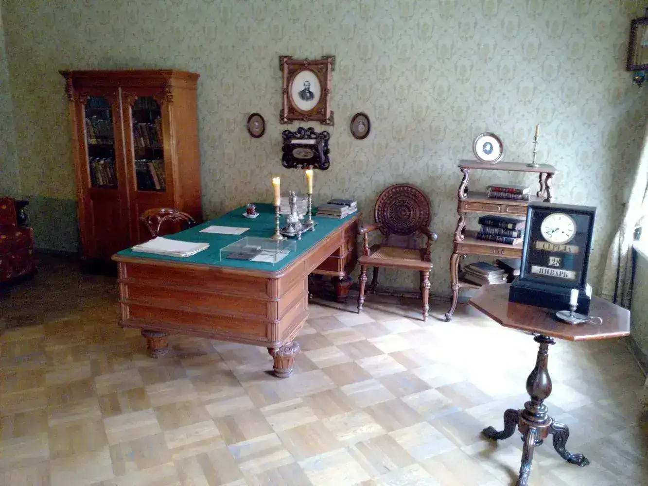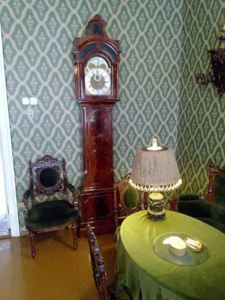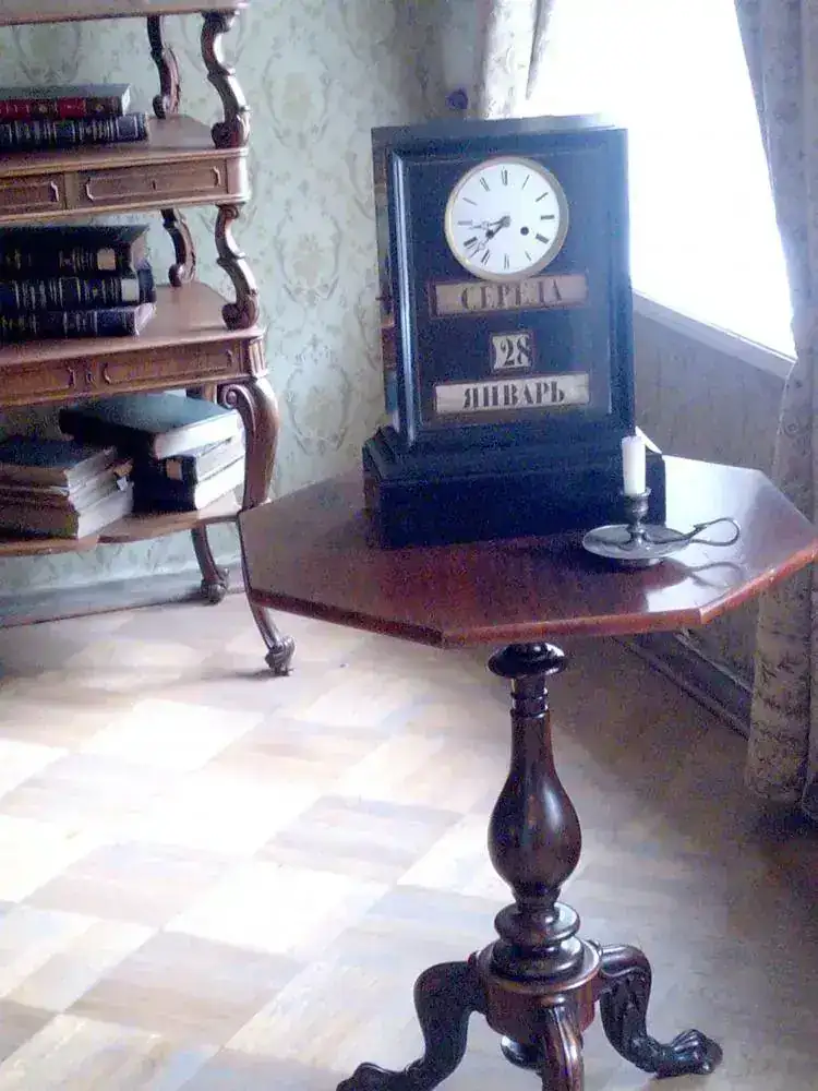 No obstante, tuve ocasión de ver otra parte muy diferente de la sociedad rusa al visitar la casa-museo del escritor Fíodor Dostoievski (1821-1881). Esa casa se halla en una zona alejada de la zona del palacio de invierno y de otros palacios, y que parece de clase media, en la que además transcurren varias novelas del escritor. En la planta en la que él con su familia vivió, se hallan algunos objetos personales. Os voy a poner imágenes de algún objeto, en concreto el reloj familiar que veréis fue detenido en el momento del fallecimiento del escritor.