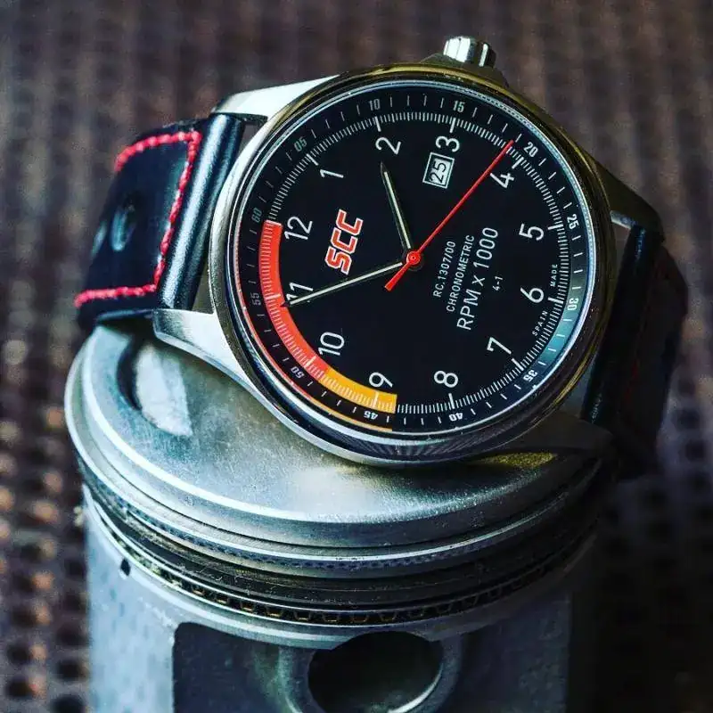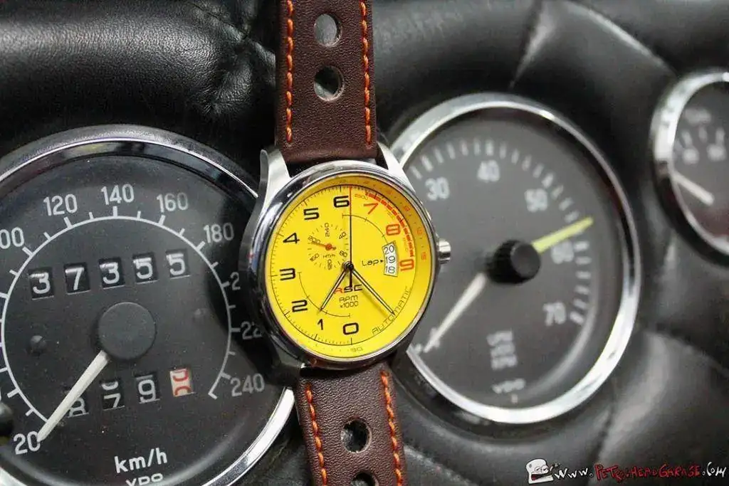 Nótese el segundero como barra horizontal y que el reseteo de los cronos tiene el cero en la posición de los velocímetros de los coches![]()